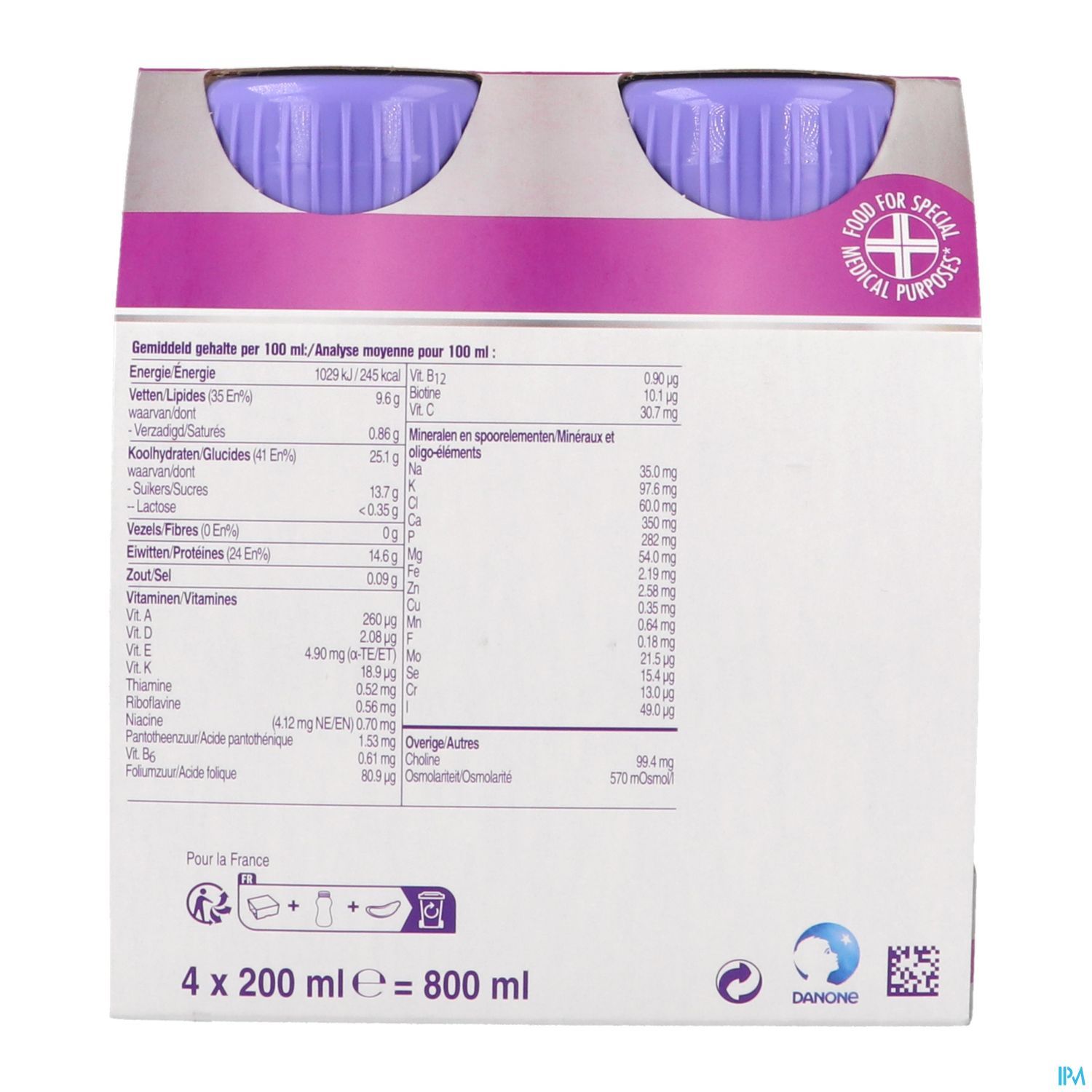 - Hyperénergétique avec un apport de 306 kcal par bouteille de 125 ml
