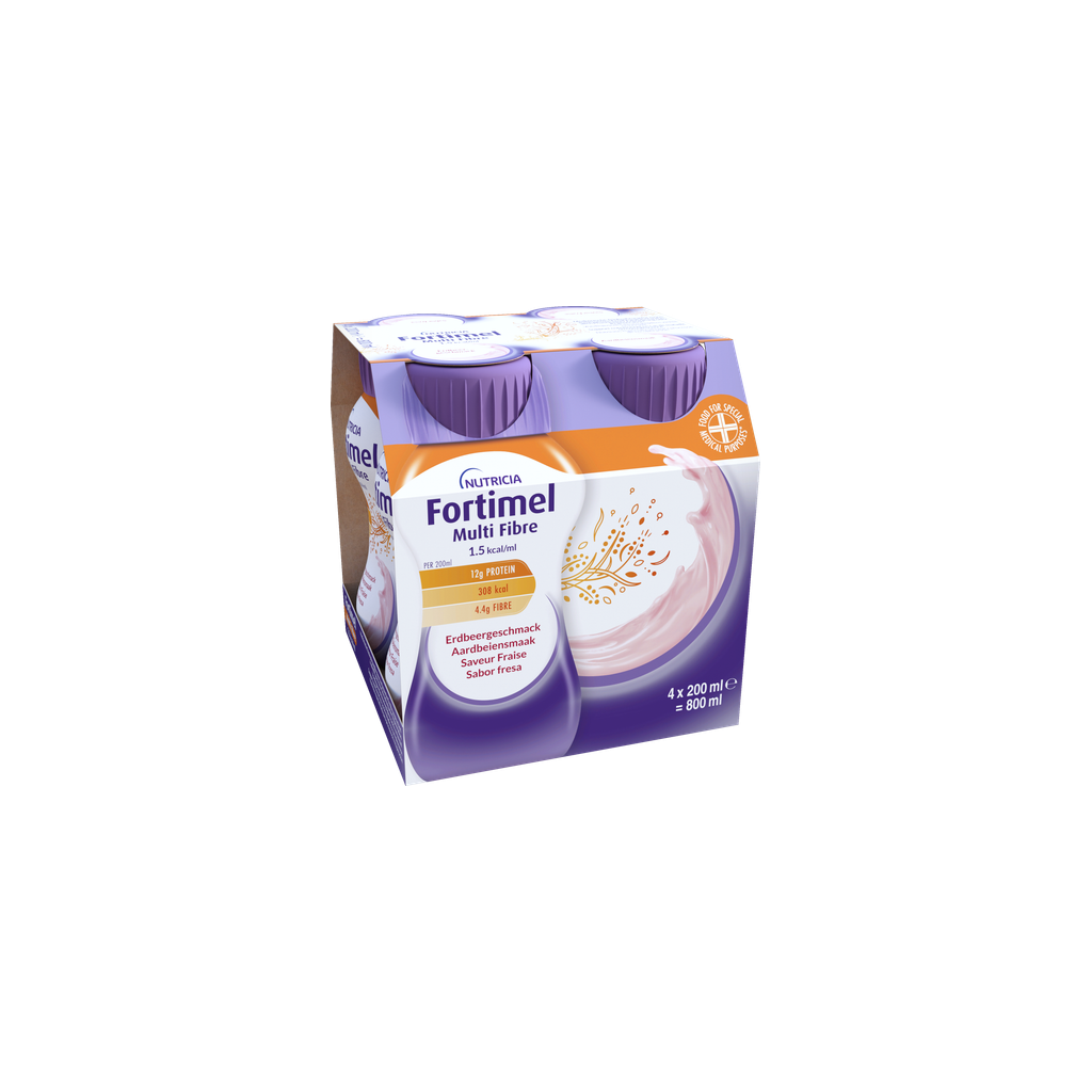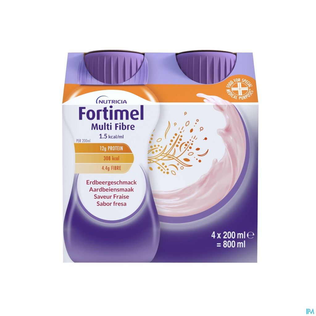 Eau, maltose dextrine, protéines de lait de vache, saccharose, huiles végétales (huile de colza, huile de tournesol), fibres alimentaires (polysaccharides de soja, inuline, oligofructose, amidon résistant, gomme arabique, cellulose), citrate de potassium émulsifiant (lécithine de soja), chlorure de magnésium, phosphate tricalcique, arôme, régulateur d'acidité (acide citrique), chlorure de choline, colorant (acide carminique), caroténoïdes (contient du soja) (b-carotène, lutéine, oléorésine de lycopène provenant de tomates), hydroxyde de potassium, hydroxyde de calcium, L-ascorbate de sodium, lactate de fer, hydroxyde de magnésium, sulfate de zinc, nicotinamide, gluconate de cuivre, acétate de rétinyle, acétate de DL-α-tocophéryl, sulfate de manganèse, sélénite de sodium, D-pantothénate de calcium chlorure de chrome, D-biotine, cholécalciférol, chlorhydrate de thiamine, acide ptéroylmonoglutamique, chlorhydrate de pyridoxine, cyanocobalamine, molybdate de sodium, fluorure de sodium, riboflavine, iodure de potassium, phylloquinone.