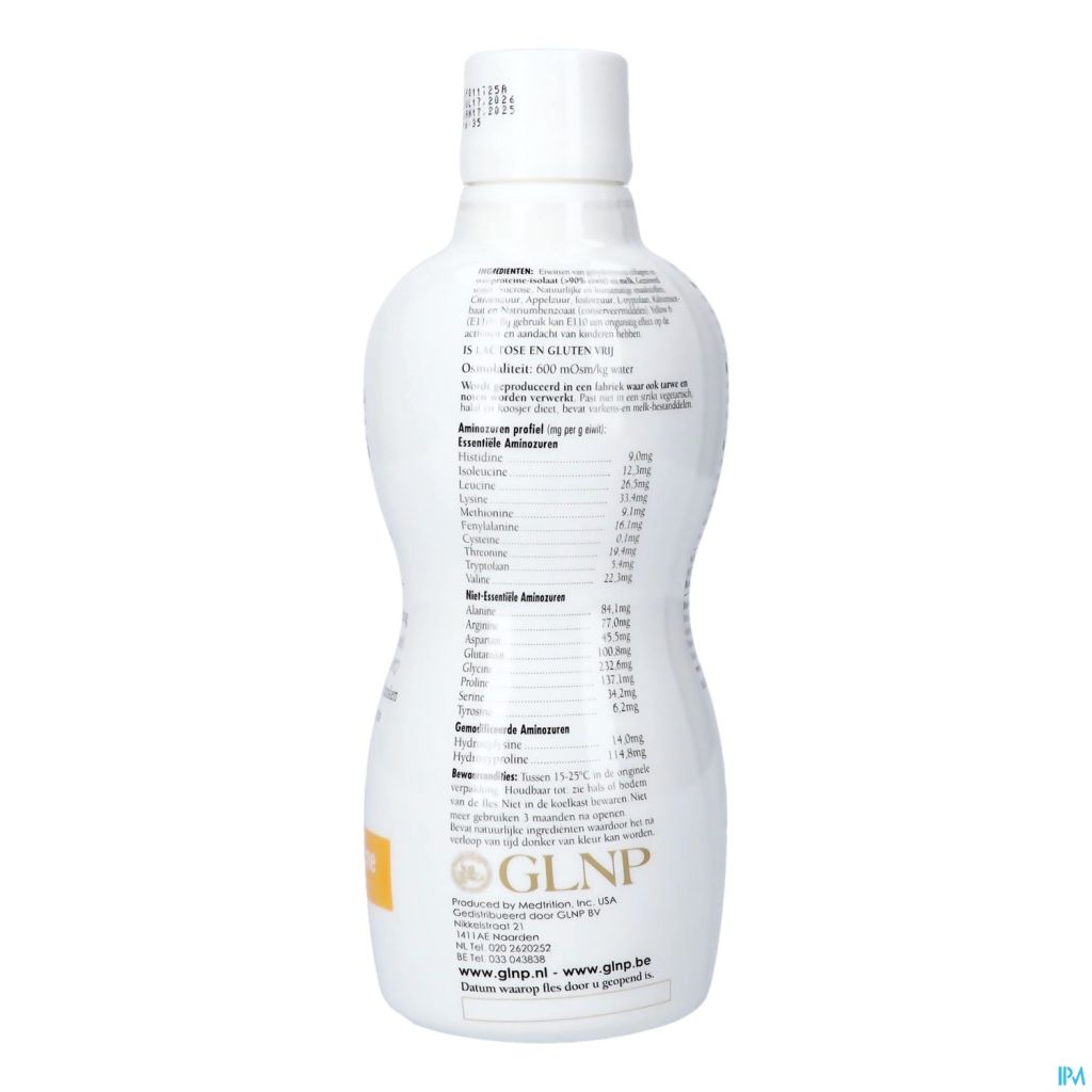 Protéines de collagène hydrolysé et isolat de protéines de lactosérum (>90% de protéines) provenant du lait. Eau purifiée, saccharose. Arômes naturels et artificiels : acide citrique, acide malique, acide phosphorique, L-tryptophane, conservateurs : sorbate de potassium et benzoate de sodium. Colorants : Jaune 6 (E110).