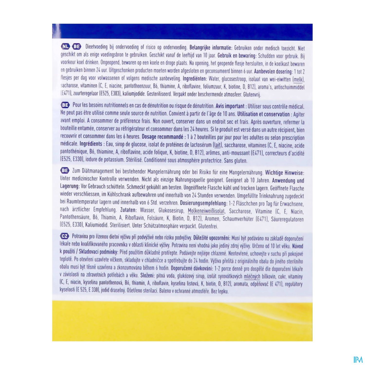 Eau, sirop de glucose, isolat de protéines de lactosérum (LAIT), saccharose, vitamines (C, E, niacine, acide pantothénique, B6, thiamine, A, riboflavine, acide folique, K, biotine, D, B12), arômes, agent antimousse (E471), régulateurs d'acidité (E525, E303), iodure de potassium.