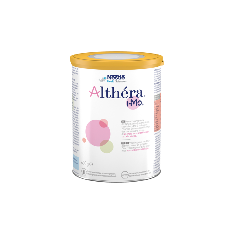 Althéra est un aliment diététique destiné aux nourrissons présentant une allergie aux protéines du lait de vache. Formule hypoallergénique fortement hydrolysée. Lactose purifié pour un meilleur goût. Avec HMO (2'FL et LNnT). La recherche montre (Vandenplas et al. 2019) que les nourrissons avec AlthéraHMO (par rapport à Althéra sans HMO) ont moins souffert d'infections des poumons, des oreilles, du tractus gastro-intestinal et, par conséquent, ont dû utiliser moins souvent des antibiotiques et des antipyrétiques. Les nourrissons et les enfants allergiques aux protéines du lait de vache qui sont nourris avec la formule AlthéraHMO ont un microbiome intestinal plus proche de celui des nourrissons allaités[1].