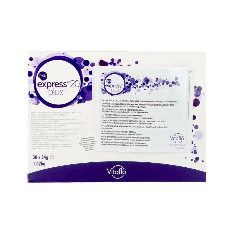 PKU expressTMplus est un substitut protéique sans phénylalanine* sous forme de poudre, contenant des acides aminés essentiels et non essentiels, des hydrates de carbone, des vitamines, des minéraux, des oligo-éléments et de l'acide docosahexaénoïque (DHA). Disponible en plusieurs saveurs.