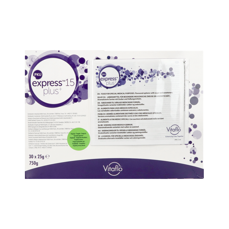 PKU expressTMplus est un substitut protéique sans phénylalanine* sous forme de poudre, contenant des acides aminés essentiels et non essentiels, des hydrates de carbone, des vitamines, des minéraux, des oligo-éléments et de l'acide docosahexaénoïque (DHA). Disponible en plusieurs saveurs.