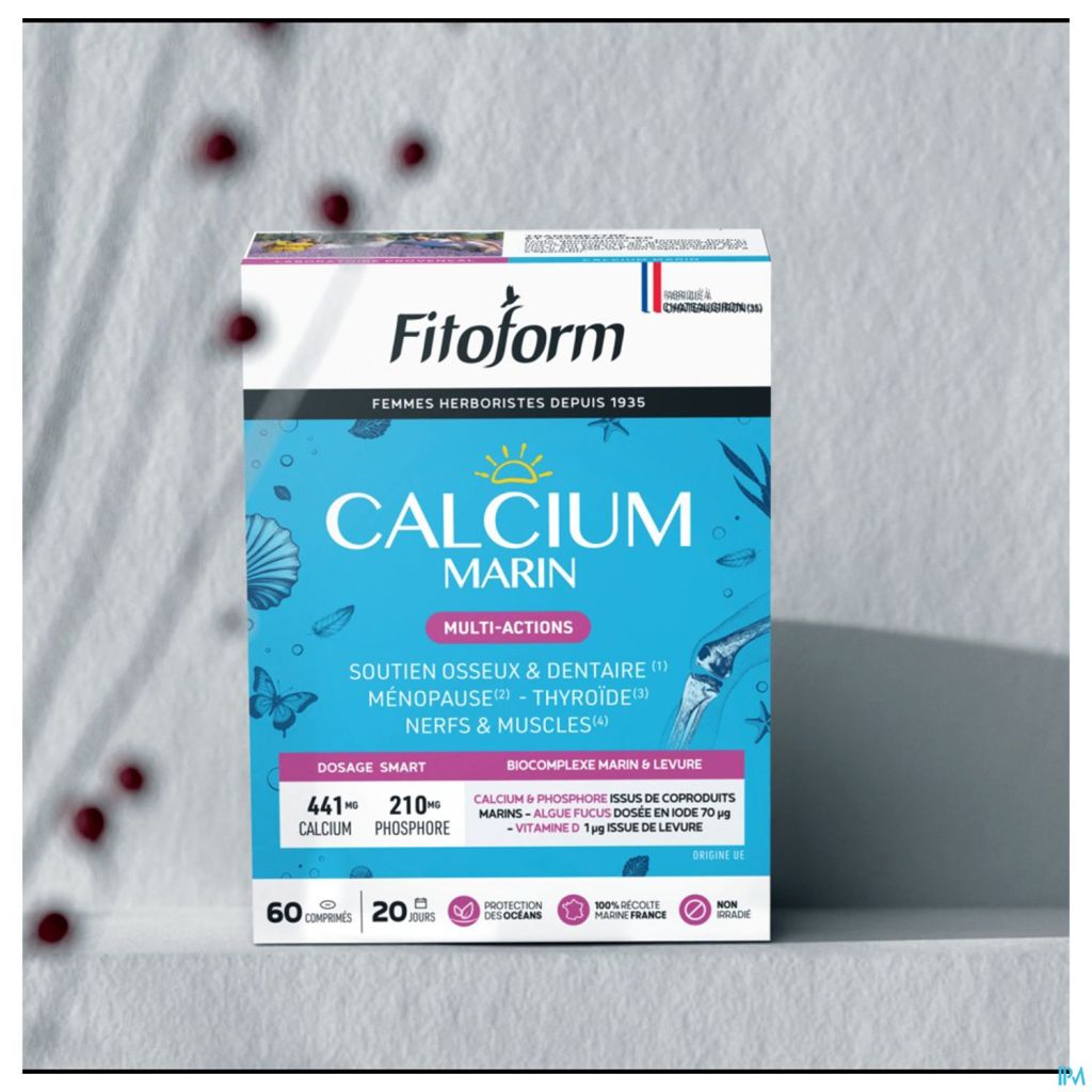 Extrait de poisson dosé en minéraux : calcium et phosphore. Charges : maltodextrine, cellulose microcristalline. Antiagglomérant : phosphate tricalcique. Thalles de Fucus vesiculosus. Émulsifiants : mono- et diglycérides d'acides gras d'origine végétale. Levure de bière (Saccharomyces cerevisiae).