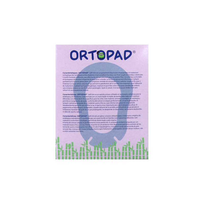 Cache oculaire occlusif pour soins orthoptiques. ORTOPAD® soft girls est composé d'un non-tissé en cotton pur. Surface douce perméable à l'air pour un maximum de confort. Forme anatomique avec fentes pour une parfaite adaptation au visage. Adhésif HOT MELT hypoallergénique. Garniture intérieure centrale très fine, douce et absolument opaque pour une occlusion totale. 5 tout nouveaux motifs pour filles, imprimés en relief.