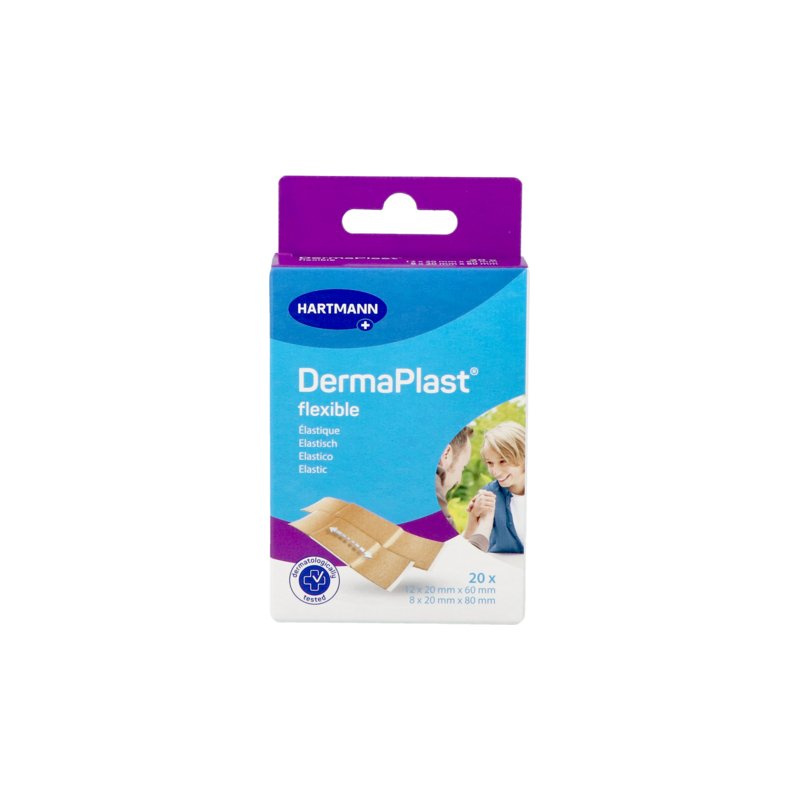 Les pansements Dermaplast Flexible des laboratoires Hartmann sont des pansements élastiques, souples, hypoallergéniques et perméables à l'air. La compresse centrale n'adhère pas à la plaie. Deux dimensions : 20 x 60 mm et 20 x 80 mm