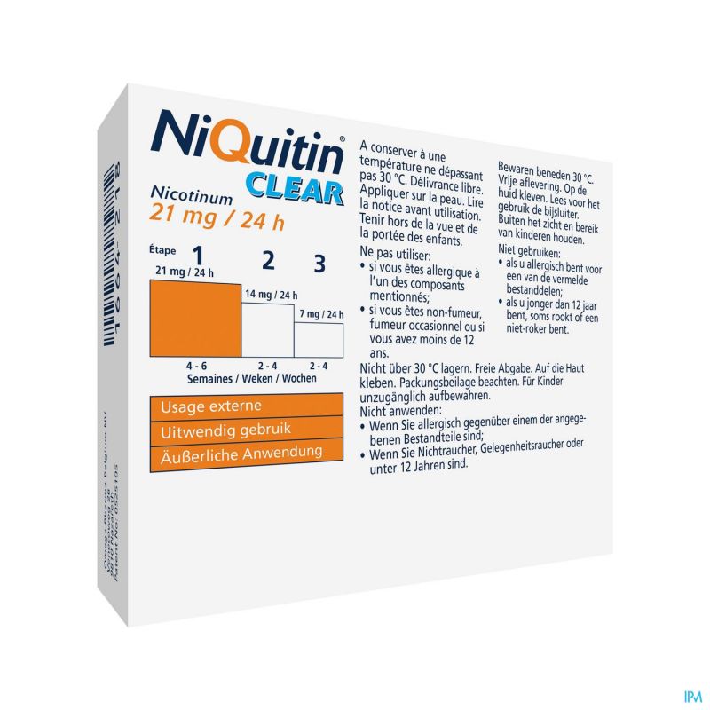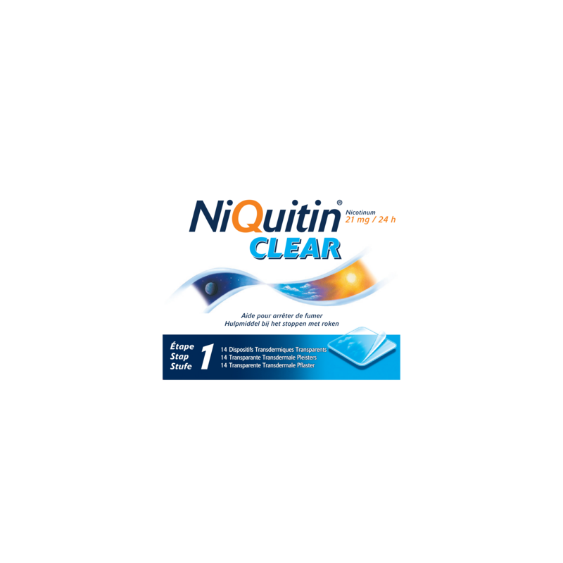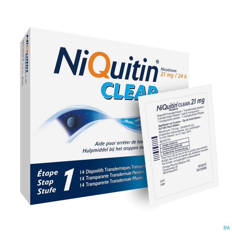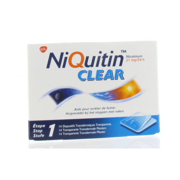 - 21 mg est la première étape du traitement de sevrage tabagique: NiQuitin® Clear Patch existe en 3 concentrations (21 mg, 14 mg et 7 mg). Ils libèrent chacun une quantité différente de nicotine. Vous réduisez donc progressivement votre besoin de cigarette en 3 étapes (cf. Schéma posologique).
