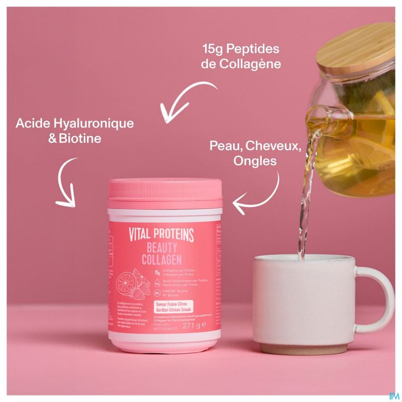 Peptides de collagène bovin, poudre de fraise (Fragaria ananassa) (7,5%), inuline, arômes, jus de citron hydraté (Citrus limon (L.) Osbeck) (2,4%), poudre d'eau de coco (Cocos nucifera L.), acide hyaluronique (à partir de hyaluronate de sodium), biotine.