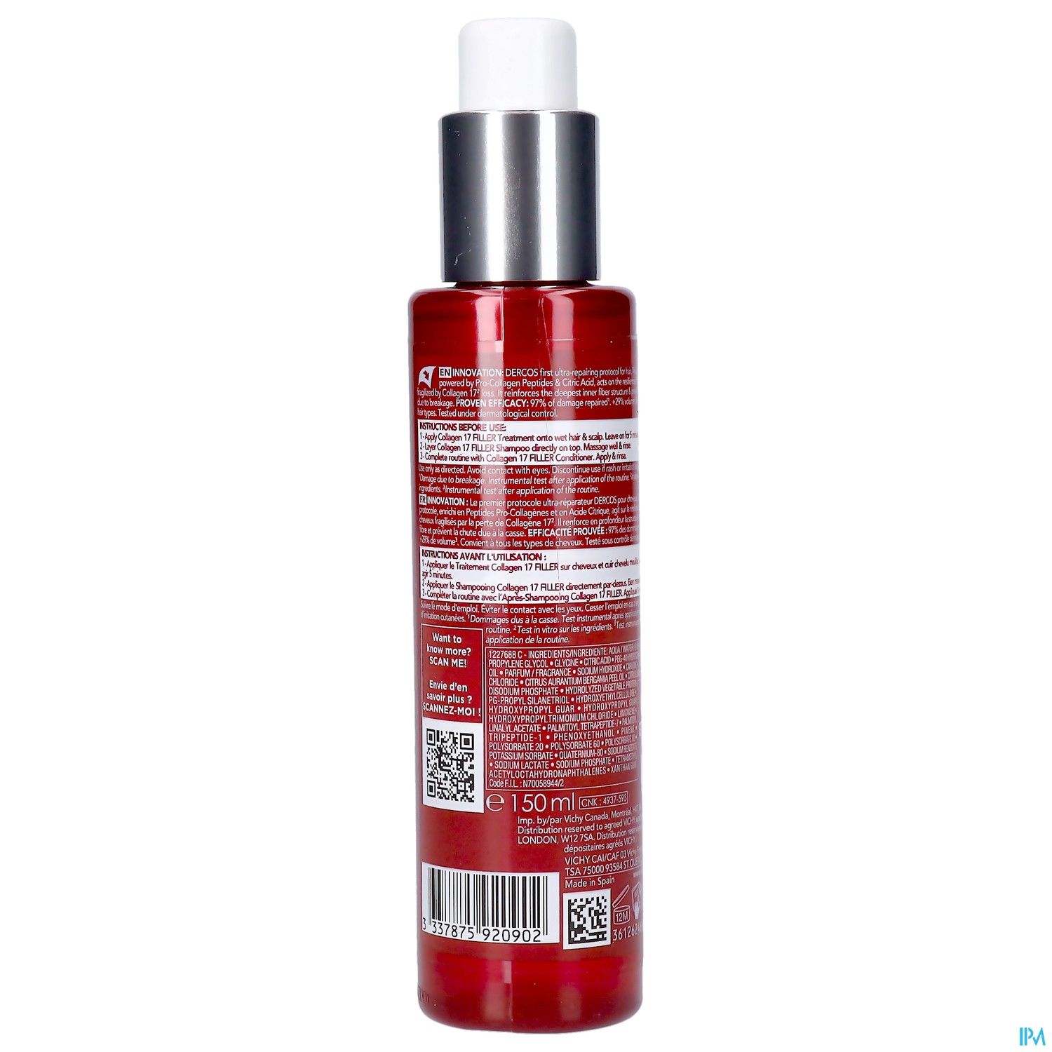 - Le pré-shampooing Vichy Dercos Collagen 17 Filler est spécialement conçu pour les hommes et les femmes qui ont les cheveux fragiles et abîmés.