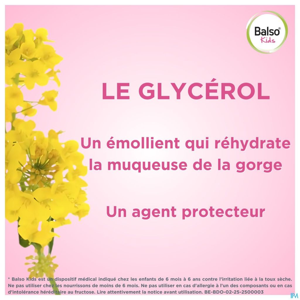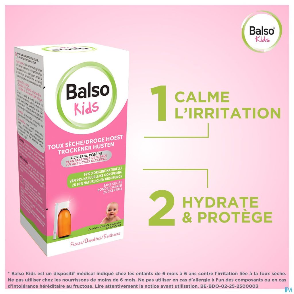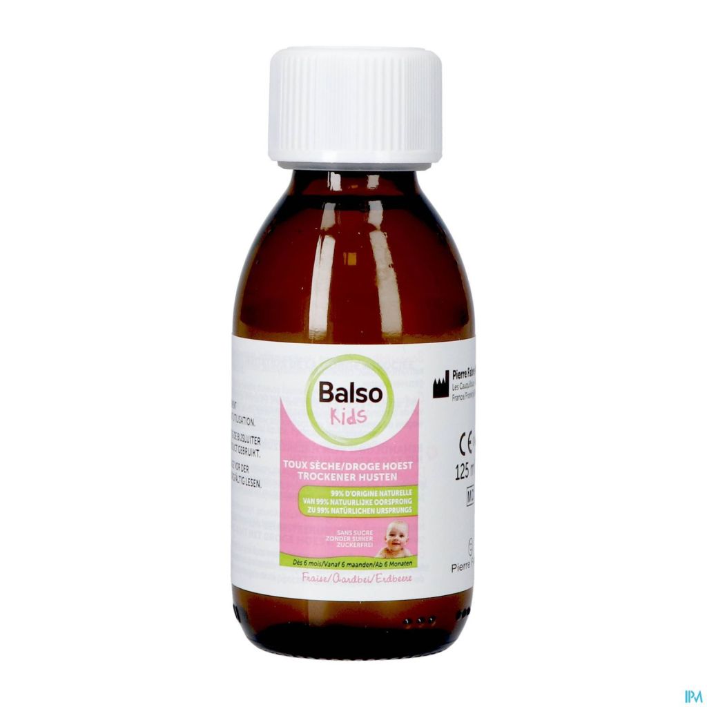 Balso kids est un sirop pour les enfants de 6 mois à 6 ans contre l'irritation due à la toux sèche provoquée par les infections virales du vent à l'origine des rhinopharyngites et des rhumes et par certaines agressions extérieures comme la présence de fumée de cigarette, la pollution, la poussière...