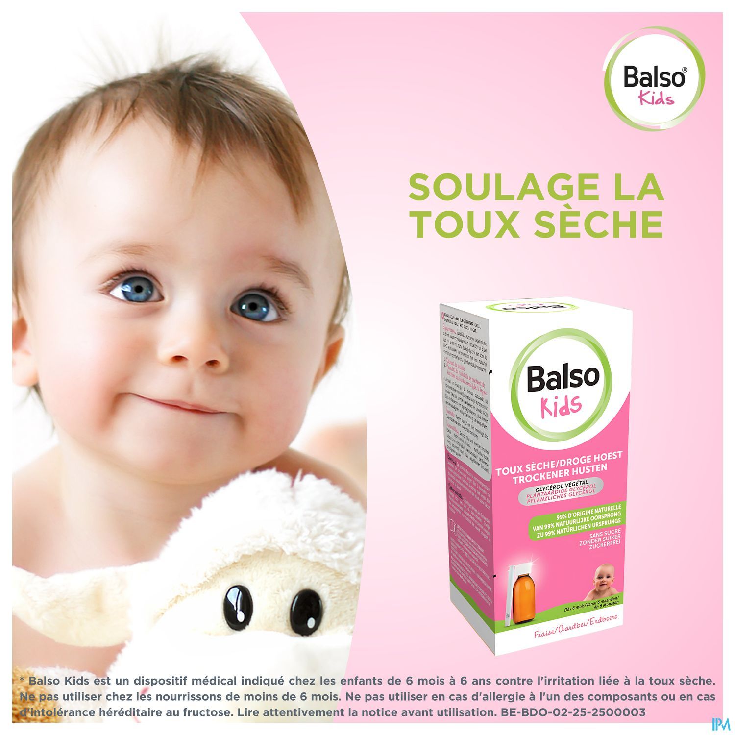 En cas de signes de gravité associés à la toux sèche (tels que difficulté à respirer, fièvre persistante au-delà de 3 jours, vomissements répétés, difficultés à s'alimenter, diarrhée, modifications du comportement ou trouble du sommeil,…), consultez votre médecin. En effet, la toux est le plus souvent liée à une infection virale des voies respiratoires, mais elle peut être le signe d'une maladie nécessitant une prise en charge spécifique (laryngite, pneumopathie, asthme,…). En cas de contact involontaire avec le nez, les yeux ou les oreilles du nourrisson/enfant, rincer à l'aide de sérum physiologique pour éliminer le sirop.