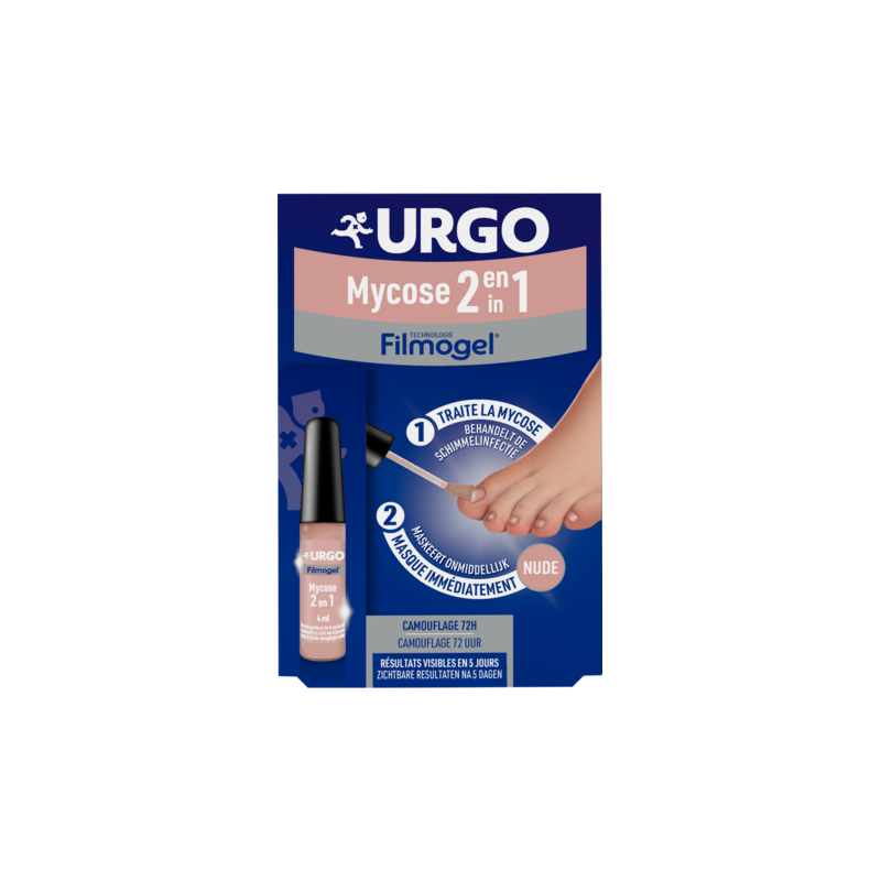 URGO Filmogel® Mycosis 2-en-1 avec Olile-ActiveTM, un composant breveté d'origine naturelle. Il forme un film coloré qui masque et traite les mycoses avec une couverture neutre. La solution pour couvrir les ongles atteints de mycose et embellir l'apparence de vos ongles.