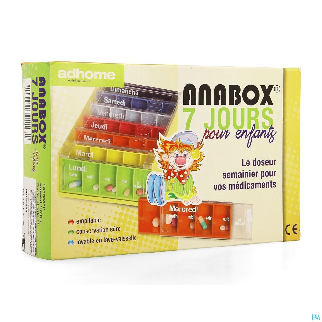 Boîte à Médicaments Enfants Anabox Pour 7 Jours - 5 Compartiments par jour - Chaque Jour Une Autre Couleur - Francais
