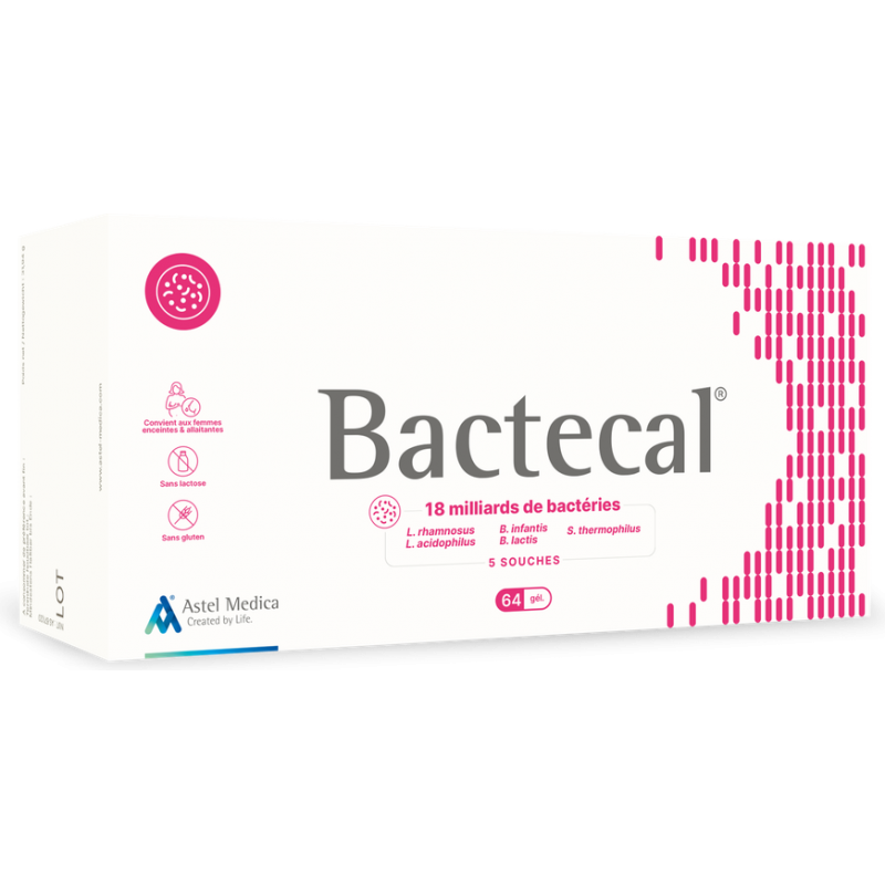 Bactecal est un complément alimentaire qui contient 3 familles de bactéries : Lactobacillus, Bifidobacterium et Streptococcus thermophilus. La concentration en bactéries de Bactecal est de 18 milliards par gélule. Compte tenu de la composition variée, de la concentration idéale et des propriétés intrinsèques de chaque ingrédient, Bactecal a un très large spectre d'applications chez l'adulte et l'enfant dès la naissance.