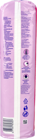 Voile testé dermatologiquement en fibres synthétiques (polypropylène), une couche de distribution en fibres synthétiques (polypropylène) pour transférer le liquide, un cœur absorbant constitué de fibres cellulosiques d'origine végétale, une couche inférieure en fibres synthétiques (polyéthylène) qui protège les sous-vêtements, une bande en papier qui protège la bande adhésive (papier enduit de silicone)
