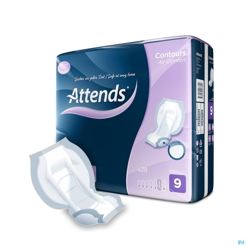 Attends Contours Air Comfort 9 sont des protections anatomiques adaptées à l'incontinence urinaire et/ou fécale sévère. Elles sont conçues pour s'adapter parfaitement et confortablement au corps, même en cas de poussées d'urine plus importantes. Une couche extérieure respirante assure la discrétion et permet d'ouvrir ce produit sans bruit.