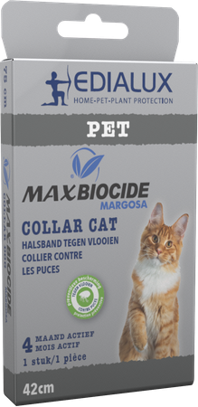 Max Biocide Collar est un produit écologique aux extraits de Margosa, à effet préventif contre les puces chez les chats. Le collier est actif durant 4 mois. La substance active s'imprègne dans le pelage de l'animal et grâce à un contact direct, les puces sont chassées. Ne pas utiliser sur les animaux malades ou en convalescence et les chats âgés moins de 10 semaines.