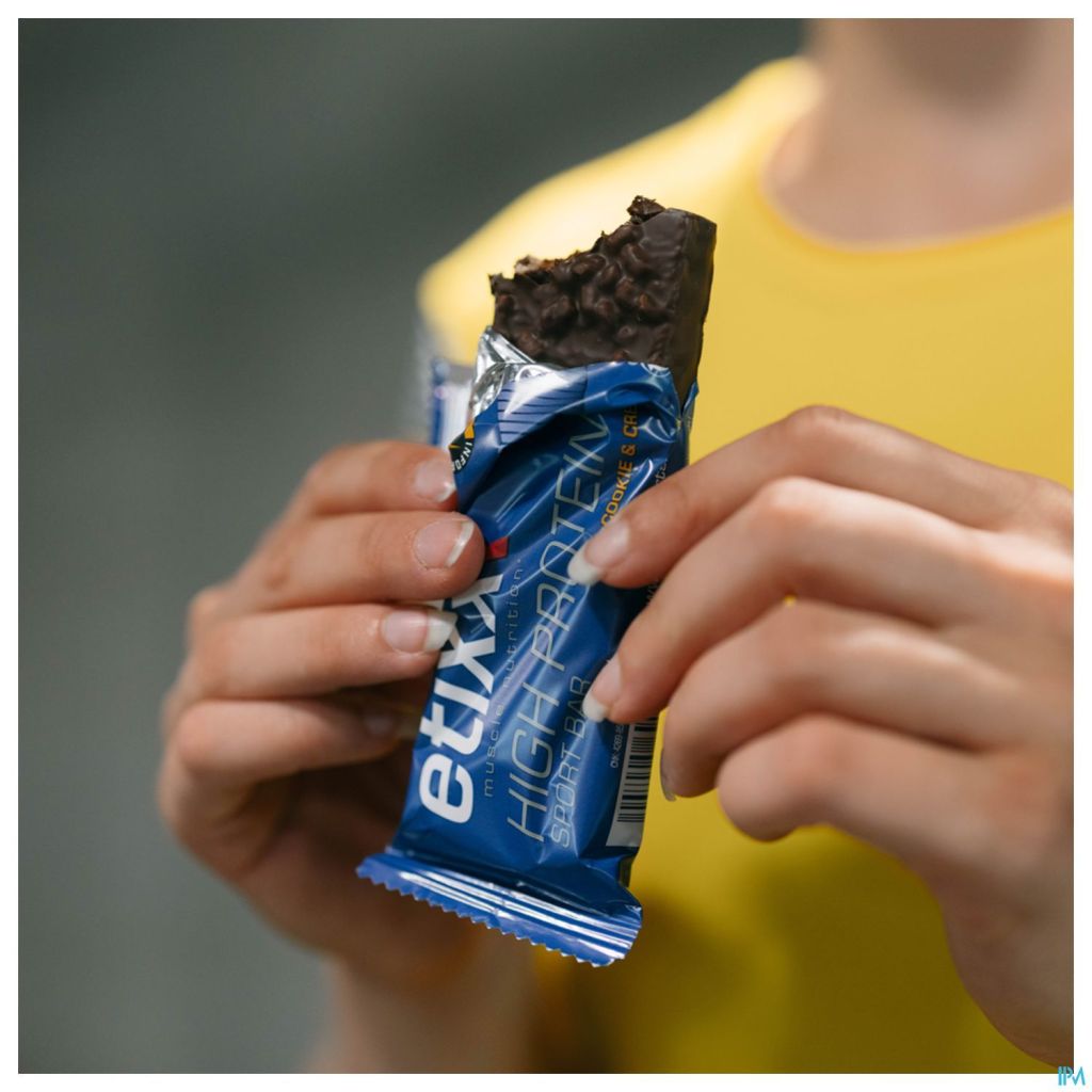 Etixx High Protein Bar apporte 20g de protéines et 15g d'hydrates de carbone et est donc le goûter idéal après un entraînement axé sur la puissance.
