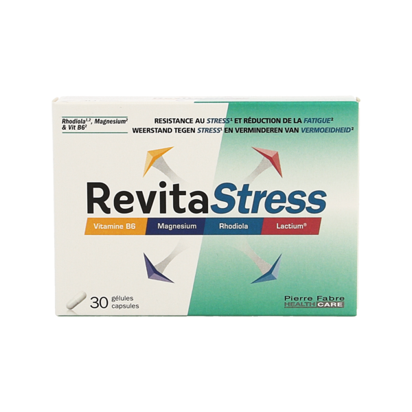 RevitaStress est un complément alimentaire à base de rhodiola qui favorise la résistance au stress. Le magnésium et la vitamine B6 contribuent à la réduction de la fatigue et au fonctionnement normal du système nerveux. Le zinc contribue au fonctionnement normal des fonctions cognitives. Lactium® est un hydrolysat de protéines de lait breveté issu de 10 années de recherche.