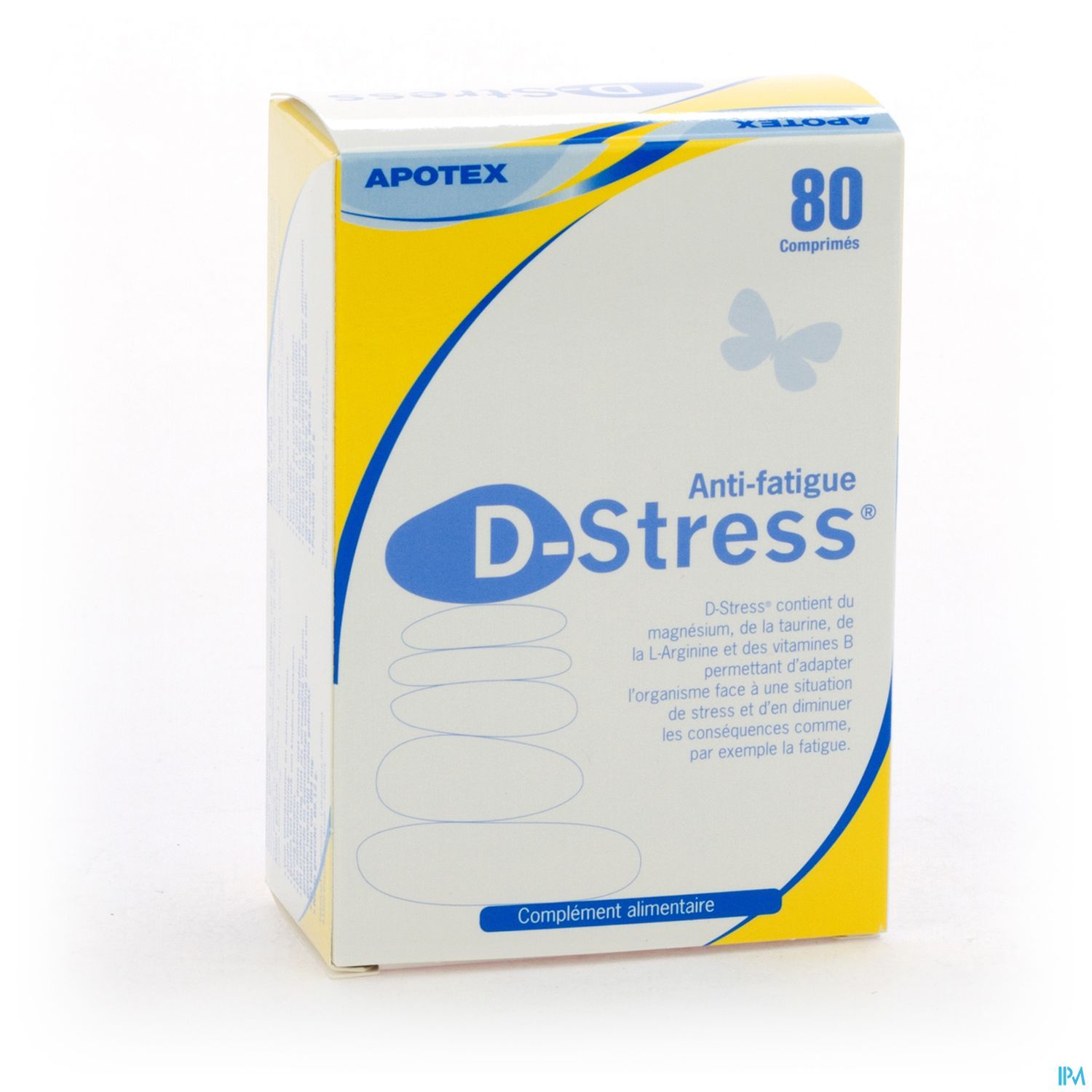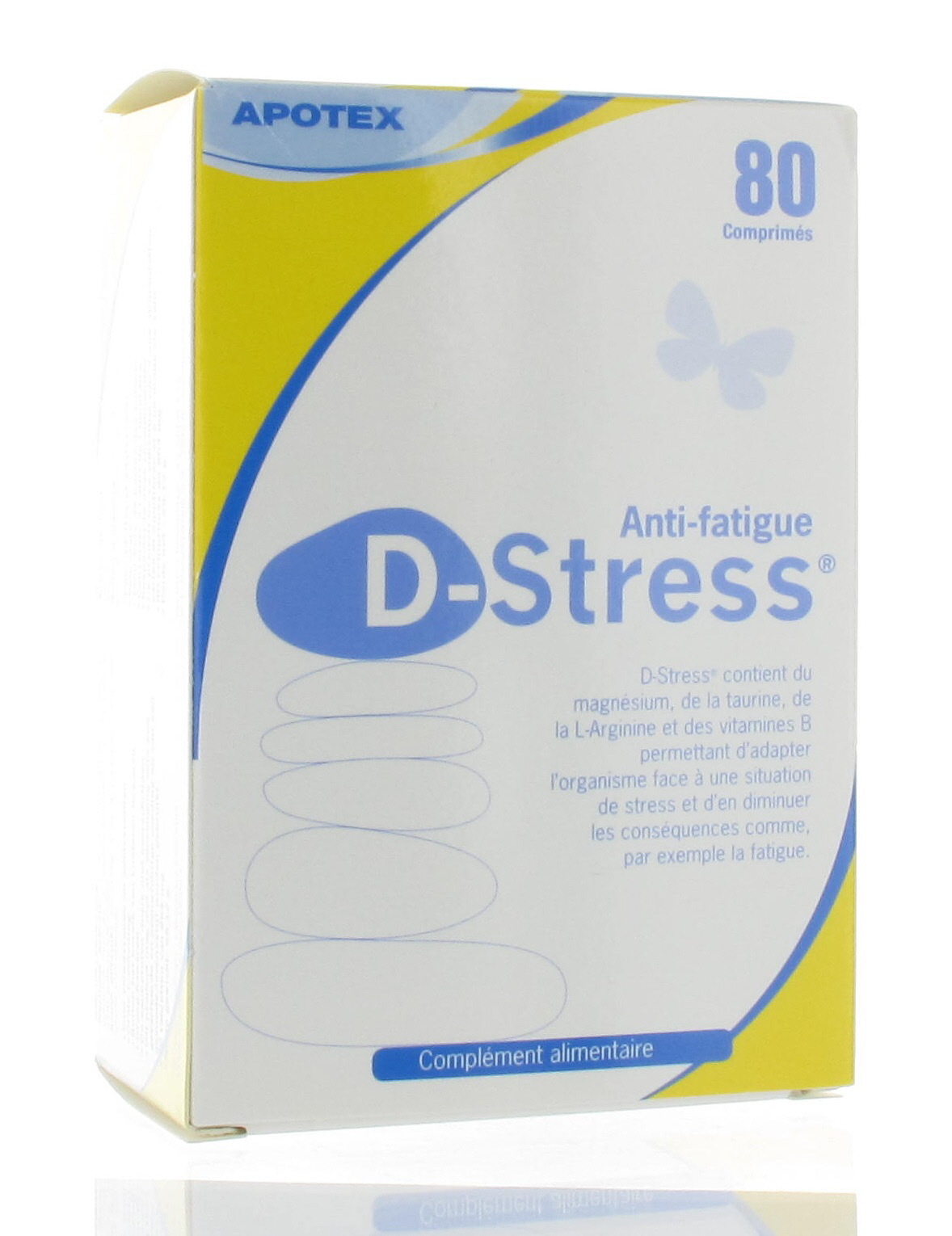 D Stress des laboratoires Apotex contient du magnésium, de la taurine, de la L-Arginine et des vitamines B permettant d'adapter l'organisme face à une situation de stress et d'en diminuer les conséquences comme, par exemple la fatigue.
