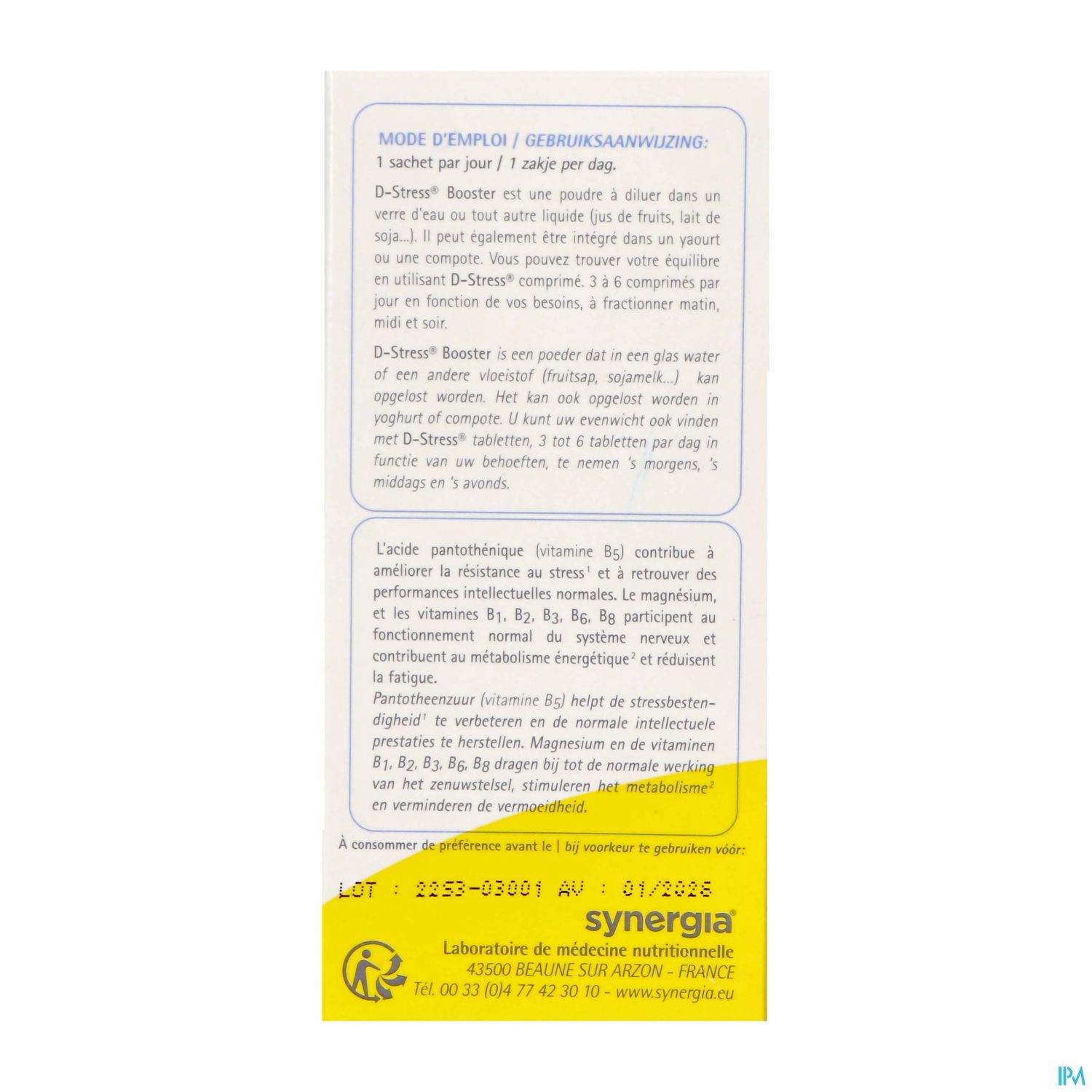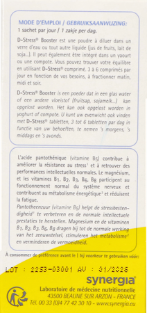 - D-Stress BOOSTER est une poudre à diluer dans un verre d'eau ou tout autre liquide (jus de fruits, lait de soja...). Il peut également être mélangé dans un yaourt ou une compote.
