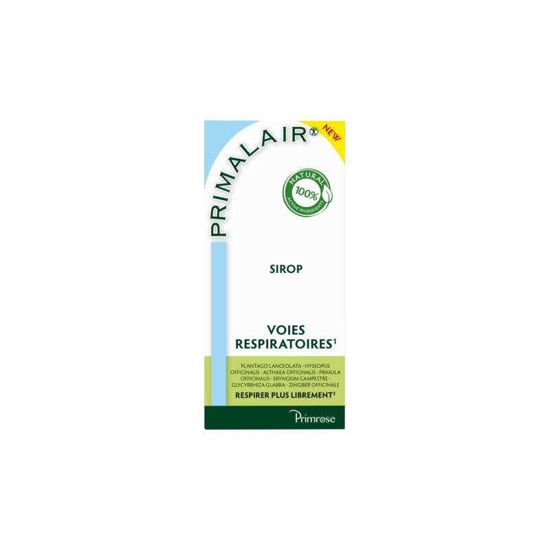 Le sirop Primalair est un complément alimentaire à base de plantain étroit, d'hysope, de petit houx, de primevère, d'onagre, de chardon marie, de réglisse et de gingembre. Le souci, le houx et le plantain étroit contribuent à apaiser les voies respiratoires et la réglisse favorise le confort respiratoire. Le gingembre aide à respirer plus librement. Ce sirop à base de plantes ne contient ni colorant ni conservateur.
