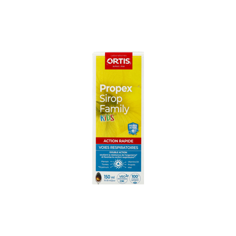 Propex Sirop Family Kids est une formule composée d'une synergie de plantes 100% d'origine naturelle, de vitamine D, de miel et de propolis, justement dosés contribuant à renforcer l'organisme face aux assauts de l'hiver. Propex Sirop Family Kids possède de par ses ingrédients une double action : apaise les voies respiratoires et renforce les défenses naturelles.