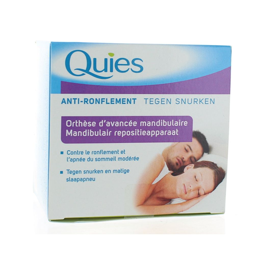 Quies Anti-ronflement orthèse d'avancée mandibulaire. Orthèse d'avancée mandibulaire est un dispositif médical destiné à réduire ou supprimer le ronflement et l'apnée du sommeil modérée. En maintenant la mâchoire inférieure en position légèrement avancée (quelques millimètres), les voies respiratoires vont s'ouvrir permettant ainsi le passage de l'air.