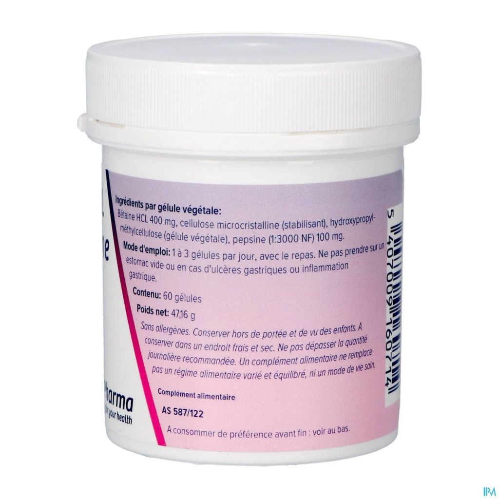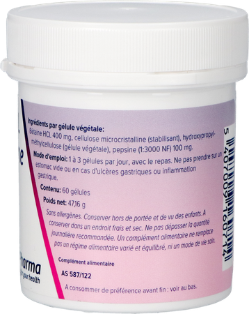 Bétaïne HCL (issue de la betterave rouge). Notre Bétaïne HCL contient également de la pepsine. La pepsine est une enzyme qui scinde les molécules de protéines afin qu'elles puissent être digérées et assimilées. La bétaïne HCL est également un donneur de méthyle. La bétaïne HCL est une source d'acide chlorhydrique. Une consommation quotidienne de 1500 mg de bétaïne contribue à un métabolisme normal de l'homocystéine. La bétaïne HCL (issue de la betterave rouge) peut être utilisée chez les personnes souffrant d'une insuffisance d'acide gastrique. Une carence en acide gastrique peut entraîner les mêmes symptômes qu'une production excessive d'acide gastrique, car les aliments commencent à fermenter en raison d'un manque d'enzymes digestives. Cela peut entraîner un péristaltisme inversé et, par conséquent, des remontées acides.