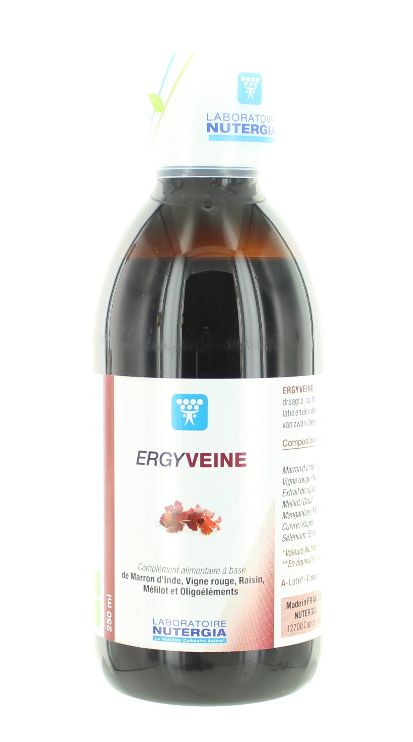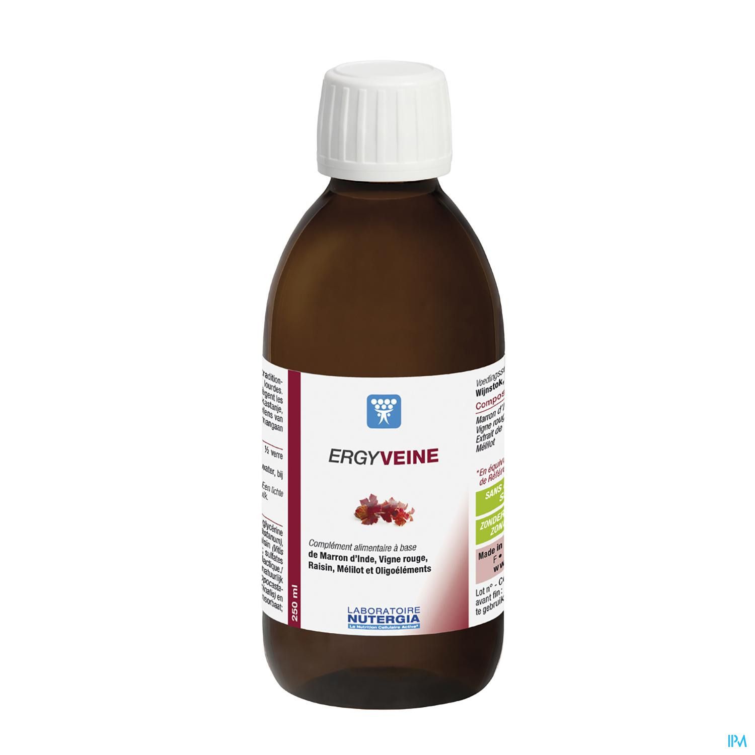 Ergyveine des laboratoires Nutergia est un complément alimentaire à base de Marron d'Inde, de Vigne Rouge, de Raisin, de Mélilot et d'oligoéléments. L'extrait de Marron d'Inde contribue à tonifier la circulation et la vigane rouge aide à diminuer les sensations de jambes lourdes.