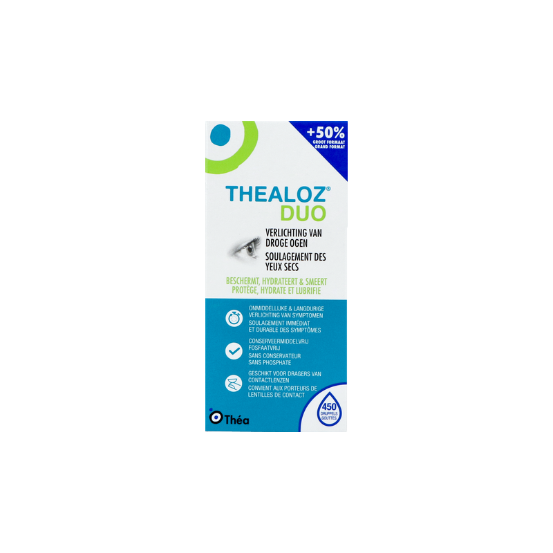 Avec THEALOZ® DUO, vous choisissez un collyre grand format (15 ml), économique, fréquemment recommandé par les ophtalmologues, reconnu pour sa qualité prouvée et sa satisfaction garantie. Se conserve jusqu'à 6 mois après ouverture.