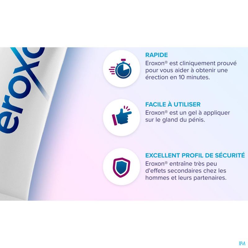 Eroxon® gel est un traitement cliniquement éprouvé pour les hommes adultes (âgés d'au moins 18 ans) atteints de dysfonctionnement érectile (également appelé impuissance). Il apparaît lorsqu'un homme ne parvient pas à obtenir ou à maintenir une érection suffisamment dure pour une activité sexuelle satisfaisante. Eroxon® stimule la circulation sanguine dans le pénis grâce à un effet physique unique de refroidissement puis de réchauffement, vous aidant à obtenir et à maintenir une érection suffisamment dure pour les rapports sexuels. Eroxon® ne vous aidera à avoir une érection que si vous êtes sexuellement excité (stimulé).