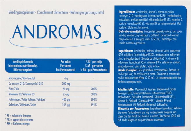 ANDROMAS® est un complément alimentaire à base de myo-inositol, de vitamine D, d'acide folique biodisponible 5-MTHF (Quatrefolic®), de sélénium, de zinc et de coenzyme Q10.