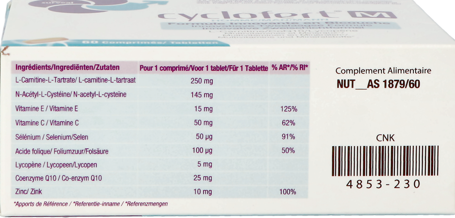 Le zinc contribue à une fertilité et une reproduction normales. Cyclofert Male™️ contient également de la L-carnitine, du lycopène, de la N-acétylcystéine, de la coenzyme Q10 et de l'acide folique.