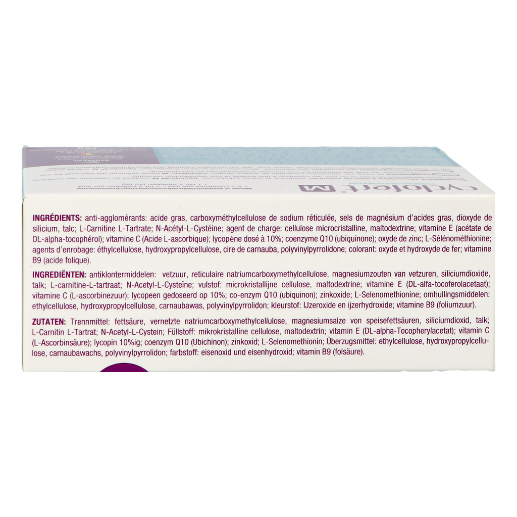 Anti-agglomérants : acide gras, carboxyméthylcellulose de sodium réticulée, sels de magnésium d'acides gras, dioxyde de silicium, talc ; L-Carnitine L-Tartrate ; N-Acétyl-L-Cystéine ; Agent de charge : cellulose microcristalline, maltodextrine ; Vitamine E (acétate de DL-alpha-tocophérol) ; Vitamine C (Acide L-ascorbique) ; Lycopène dosé à 10 % ; Coenzyme Q10 (ubiquinone) ; Oxyde de zinc ; L-Sélénométhionine ; Agents d'enrobage : éthylcellulose, hydroxypropylcellulose, cire de carnauba, polyvinylpyrrolidone ; Colorant : oxyde et hydroxyde de fer ; Vitamine B9 (acide folique)