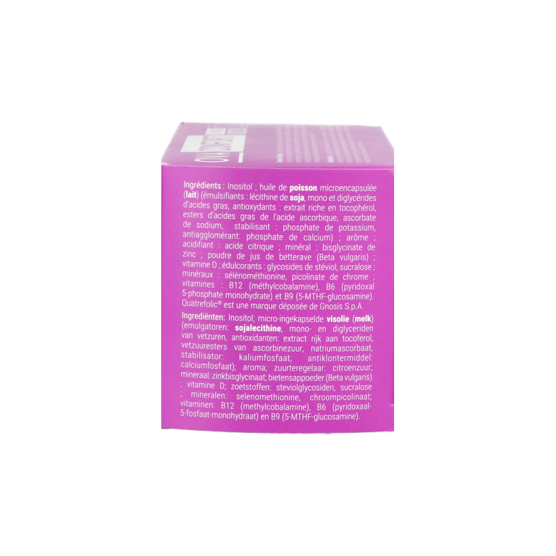 Inositol ; huile de poisson microencapsulée (lait) (émulsifiants : lécithine de soja, mono et diglycérides d'acides gras, antioxydants : extrait riche en tocophérol, esters d'acides gras de l'acide ascorbique, ascorbate de sodium, stabilisant : phosphate de potassium, antiagglomérant: phosphate de calcium) ; arôme ; acidifiant : acide citrique ; minéral : bisglycinate de zinc ; poudre de jus de betterave (Beta vulgaris) ; vitamine D ; édulcorants : glycosides de stéviol, sucralose ; minéraux : sélénométhionine, picolinate de chrome ; vitamines : B12 (méthylcobalamine), B6 (pyridoxal 5-phosphate monohydrate) et B9 (5-MTHF-glucosamine).