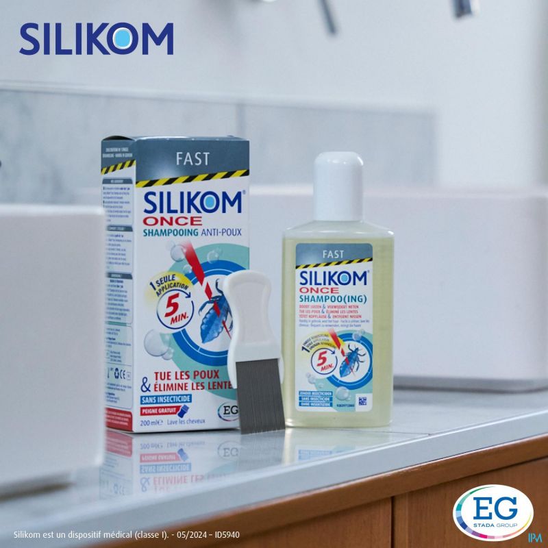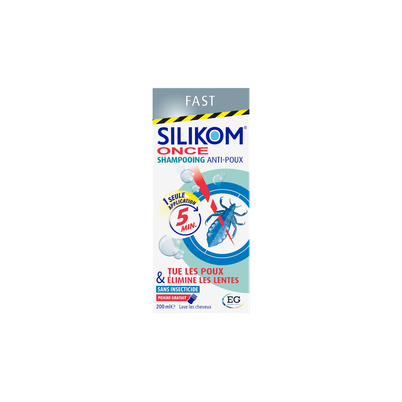 Silikom® Once Shampooing tue les poux en cinq minutes. De plus, le shampooing permet une élimination facile des oeufs des poux (lentes); il est deux fois plus efficace que le peignage seul et rend la chevelure propre et fraîche.