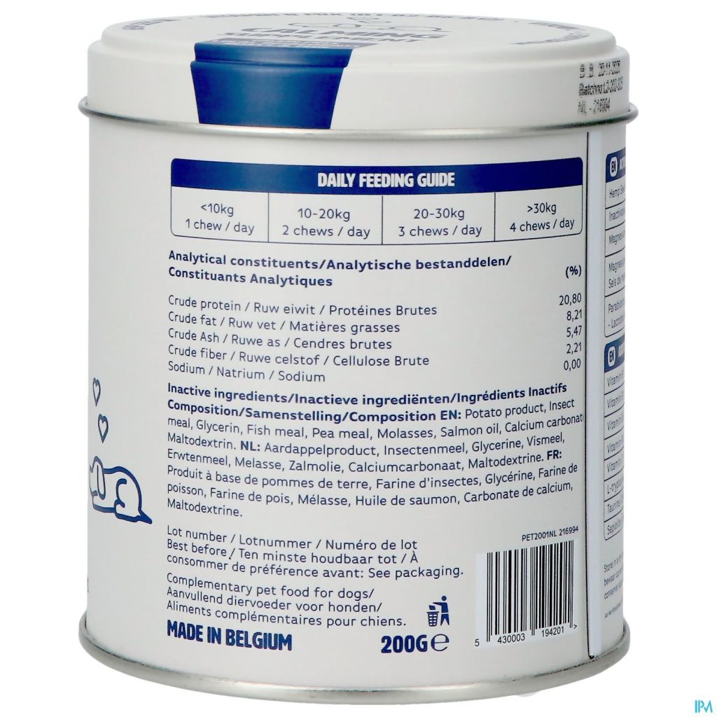 Produit à base de pommes de terre, farine d'insectes, glycérine, farine de poisson, farine de pois, mélasse, huile de saumon, carbonate de calcium, maltodextrine.