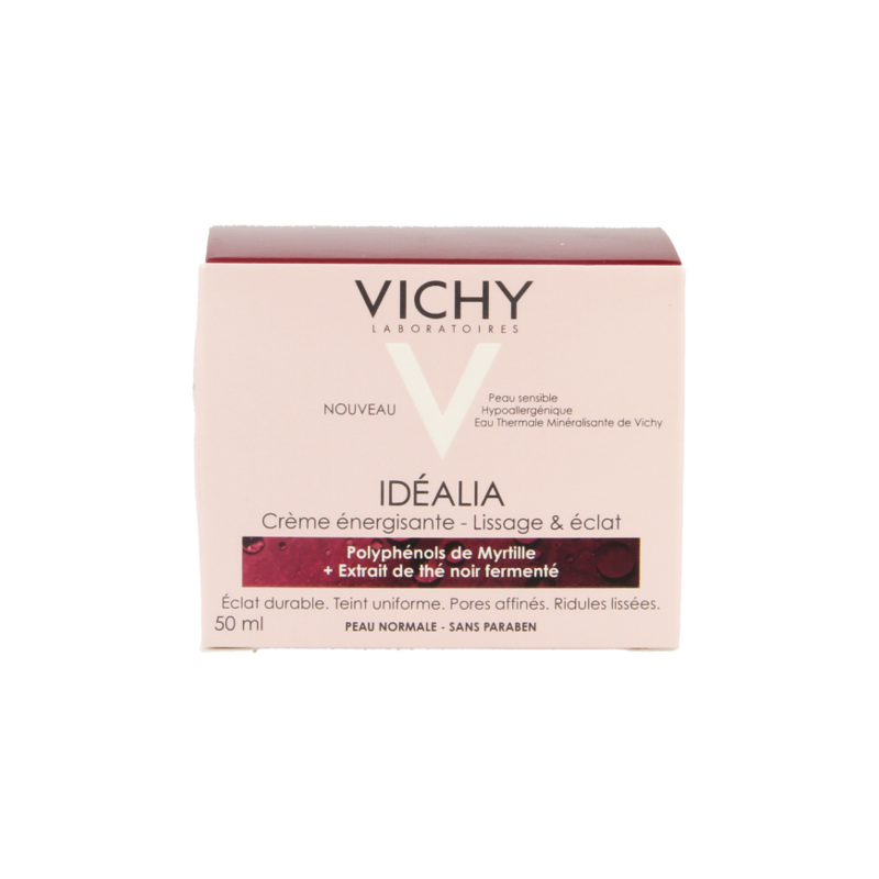 Vichy Idéalia crème énergisante est une crème qui agit simultanément et durablement sur l'uniformité du teint. Vichy Idéalia contient des polyphénols de Myrtille ainsi que des extraits de thé noir fermenté.