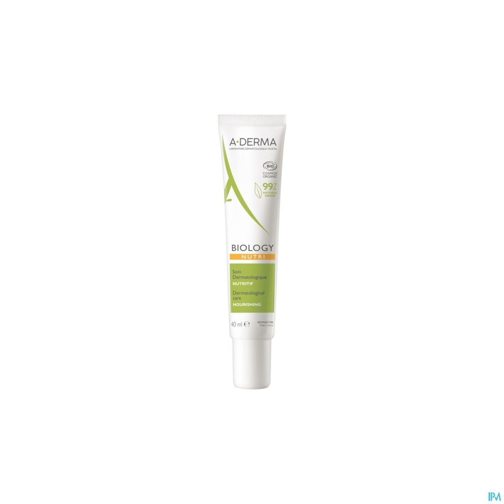 Les peaux très sèches du visage, pouvant souffrir de plaques sèches et de démangeaisons, nécessitent un soin visage efficace. Le Laboratoire A-DERMA a formulé BIOLOGY NUTRI SOIN DERMATOLOGIQUE NUTRITIF, un soin dermatologique à la tolérance optimale et certifié BIO, adapté à ces peaux fragiles. Avec sa texture fine et enveloppante, il nourrit intensément, protège du dessèchement et renforce la barrière cutanée tout en apportant une hydratation 24 h** et une protection anti-pollution. BIOLOGY NUTRI SOIN DERMATOLOGIQUE NUTRITIF à 99 % d'origine naturelle ne comprend que les ingrédients essentiels pour assurer une tolérance optimale. Testée sur peau sèche sujette à l'eczéma atopique, sa formule sans parfum ni huile essentielle s'applique sur le contour de l'œil et le visage. Sa texture fine mais enveloppante, non comédogène, peut être utilisée seule ou mélangée (1 à 3 gouttes) aux crèmes dermatologiques hydratantes BIOLOGY pour un soin sur mesure. Avoine Rhealba® issue de l'agriculture biologique. Info Vegan : sans ingrédient d'origine animale.