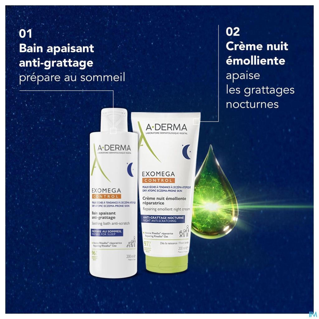 En routine soir, la routine la plus complète : 1. Dans l'eau du bain ajouter le bain apaisant un soin complémentaire pour apaiser et préparer au sommeil. 2. Laver avec gel lavant 2 en 1 une hygiène adaptée pour les peaux sèches atopique. 3. Appliquer la crème nuit émolliente réparatrice pour mettre en sommeil le grattage.