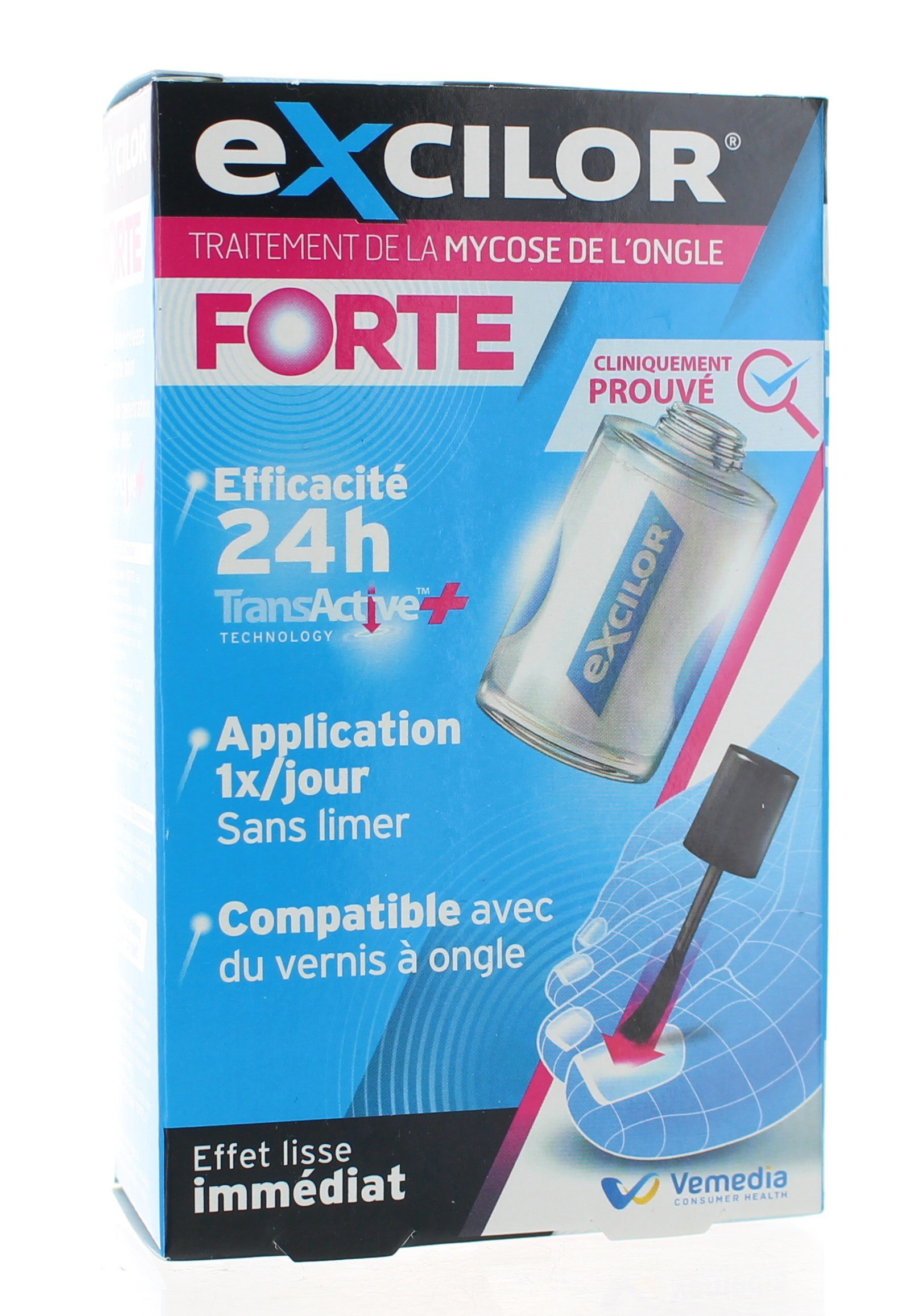 Excilor Forte est un traitement de la mycose de l'ongle cliniquement prouvé. Excilor Forte agit en abaissant rapidement après application le pH de l'ongle et rend ainsi l'environnement hostile à la prolifération des mycoses. L'ongle détérioré doit ensuite avoir le temps de repousser (plusieurs mois). Ce traitement de la mycose de l'ongle est compatible avec les vernis à ongle. Excilor Forte Mycose des Ongles est disponible en flacon de 30 ml.
