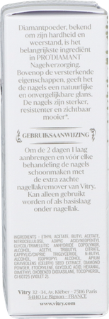 Appliquer une couche uniforme du Soin Réparateur Pro'Diamant sur des ongles propres et secs tous les 2 jours, en prenant le soin de démaquiller les ongles entre chaque application.
