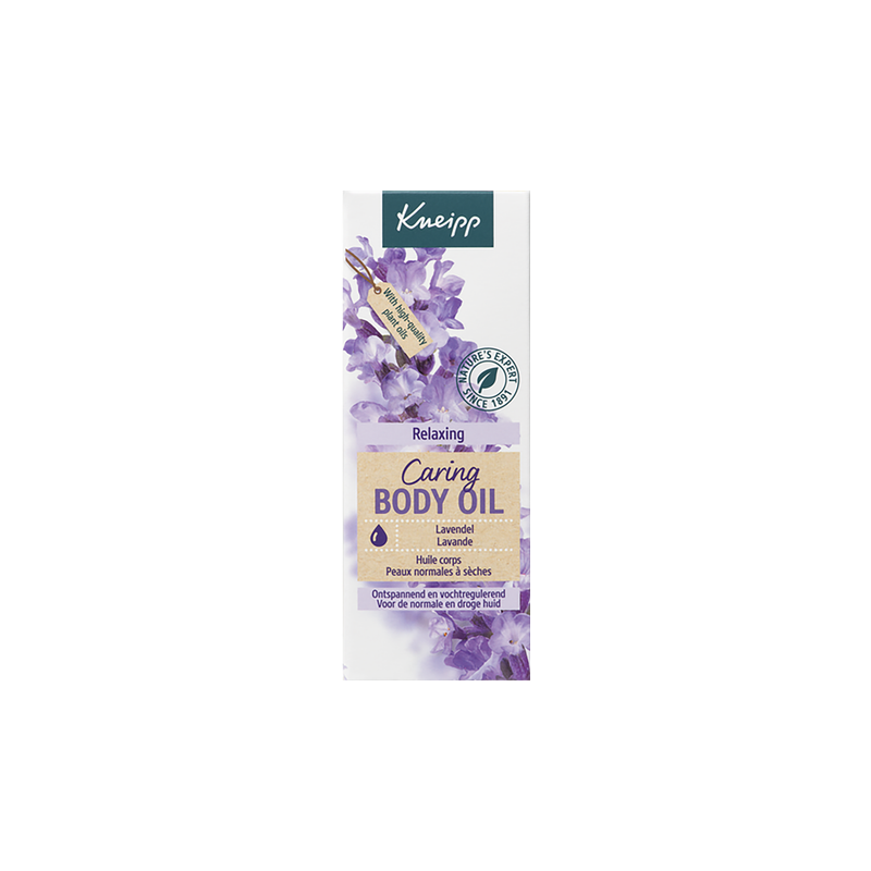 L'huile corporelle Kneipp Lavande associe l'huile essentielle de de lavande, aux vertus relaxantes, à l'huile d'amande douce, nourrissante et hydratante. Sa formule, riche en vitamines A et E, régénère la peau et la laisse souple et douce.