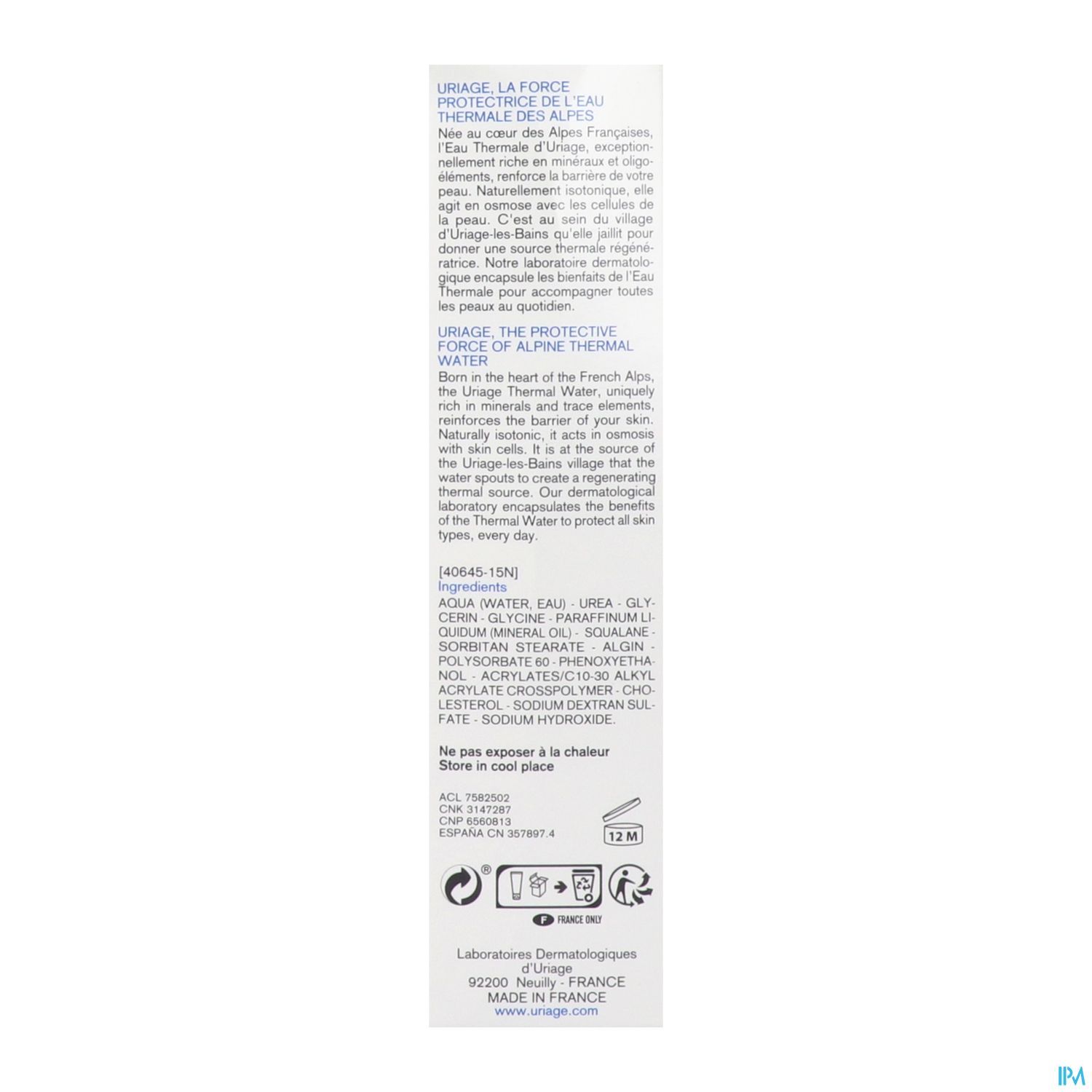 AQUA (WATER, EAU) – UREA - GLYCERIN – GLYCINE - PARAFFINUM LIQUIDUM (MINERAL OIL) – SQUALANE - SORBITAN STEARATE – ALGIN - POLYSORBATE 60 – PHENOXYETHANOL - ACRYLATES/C10-30 ALKYL ACRYLATE CROSSPOLYMER – CHOLESTEROL - SODIUM DEXTRAN SULFATE - SODIUM HYDROXIDE