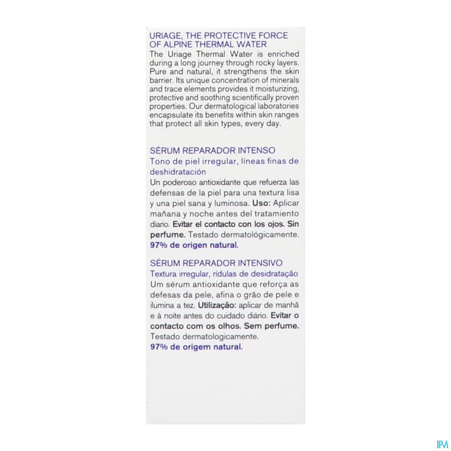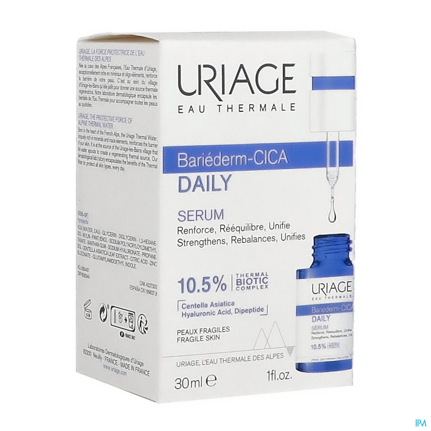 10,5 % DE COMPLEXE THERMAL-BIOTIC. Eau thermale d'Uriage, inuline (prébiotique), Centella asiatica, acide hyaluronique à haut et bas poids moléculaire, vitamine B5, dipeptides. Sans parfum. Très bien toléré. Texture fluide et fraîche. Testé sous contrôle dermatologique.