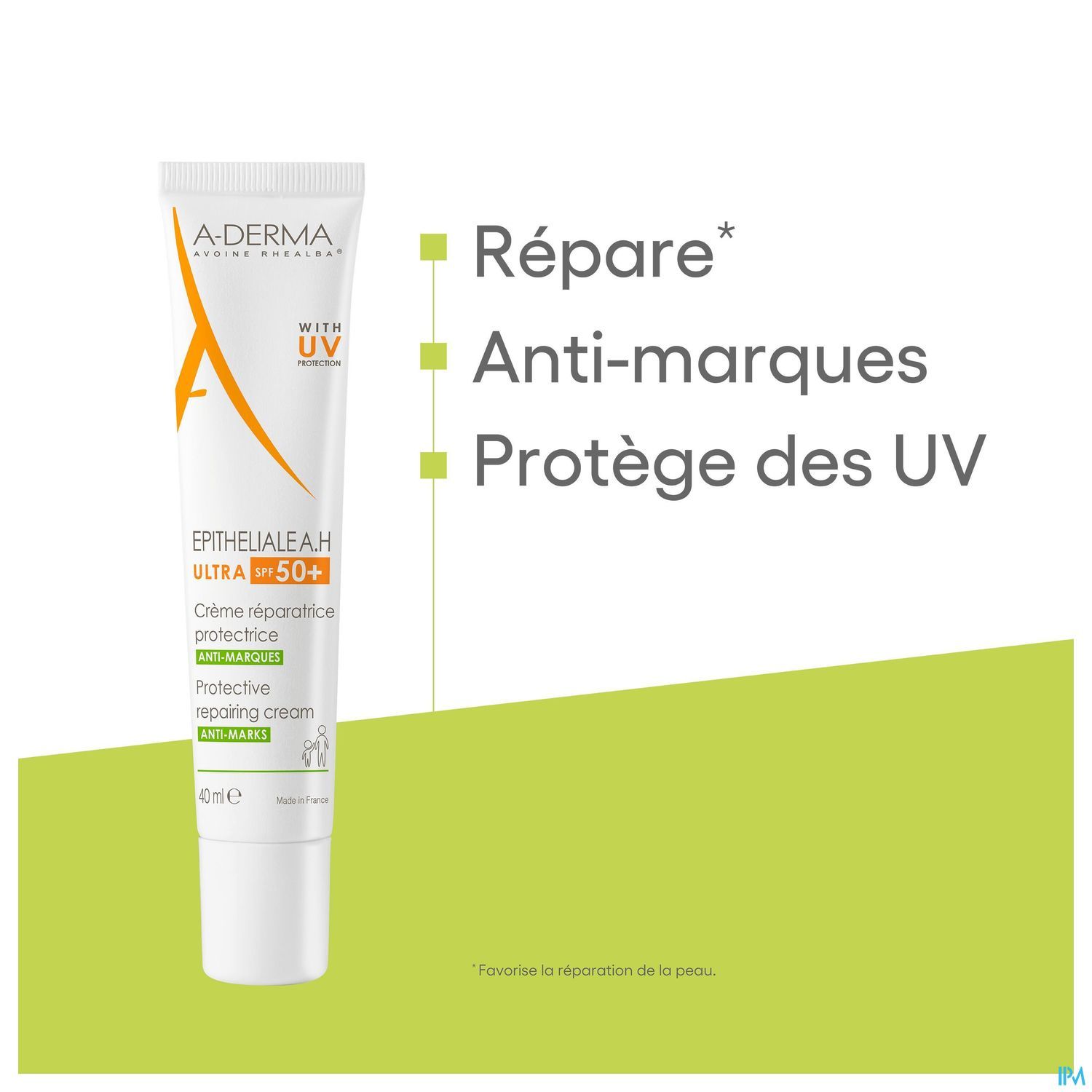 Le soin 2 en 1 EPITHELIALE A.H ULTRA SPF50+ accélère la réparation* des peaux fragilisées et leur offre une très haute protection solaire SPF 50+ avec pour objectif un double effet anti-marques rouges et brunes. Sa formule contient un complexe breveté réparateur et anti-marques de 3 actifs nommé Cicahyalumide® (Dipeptide, Acide hyaluronique et Extrait de Plantules d'Avoine Rhealba®) et la Liane du Pérou pour apaiser les sensations cutanées désagréables. Pour une utilisation haute tolérance, son système photoprotecteur comprend seulement 4 filtres en concentration optimisée qui restent à la surface de la peau même fragilisée. Sans parfum, elle est adaptée aux enfants et aux adultes, elle s'applique régulièrement sur le visage et sur le corps.