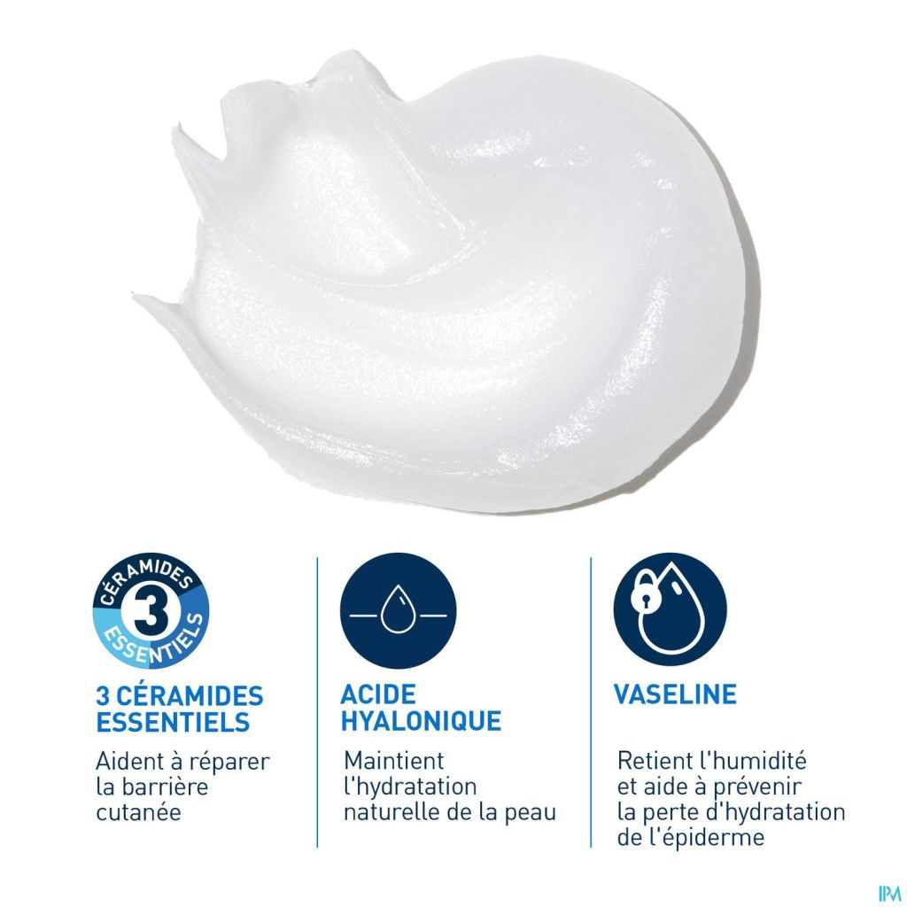 La Pommade Réparatrice Intensive de la marque CeraVe est un soin polyvalent pour visage, corps et lèvres. Elle protège et apaise immédiatement les peaux très sèches, abîmées par les agressions extérieures et craquelées. Sa formule associe 3 ingrédients phares recommandés par les dermatologues : c'est d'abord 3 céramides essentiels pour aider à maintenir la barrière naturelle de la peau ; l'acide hyaluronique pour aider à conserver l'hydratation naturelle de la peau ; et enfin le pétrolatum pour retenir l'humidité et prévenir la perte d'eau transépidermique. Résultat : votre peau est douce, immédiatement apaisée et protégée. Sa formule haute tolérance est hypoallergénique, sans parfum et sans alcool : elle convient donc aux peaux sensibles de toute la famille. Non-comédogène, elle n'obstrue pas les pores de la peau. Grâce à sa texture non collante et non grasse, la Pommade Réparatrice Intensive CeraVe est très agréable à utiliser et pénètre rapidement la peau, ce qui permet de s'habiller rapidement après l'application. Elle exerce un effet pansement qui agit comme une barrière de protection tout en laissant respirer la peau. Ce produit est le résultat de la collaboration étroite entre des dermatologues et CeraVe, une marque de confiance en matière de soins dermatologiques.