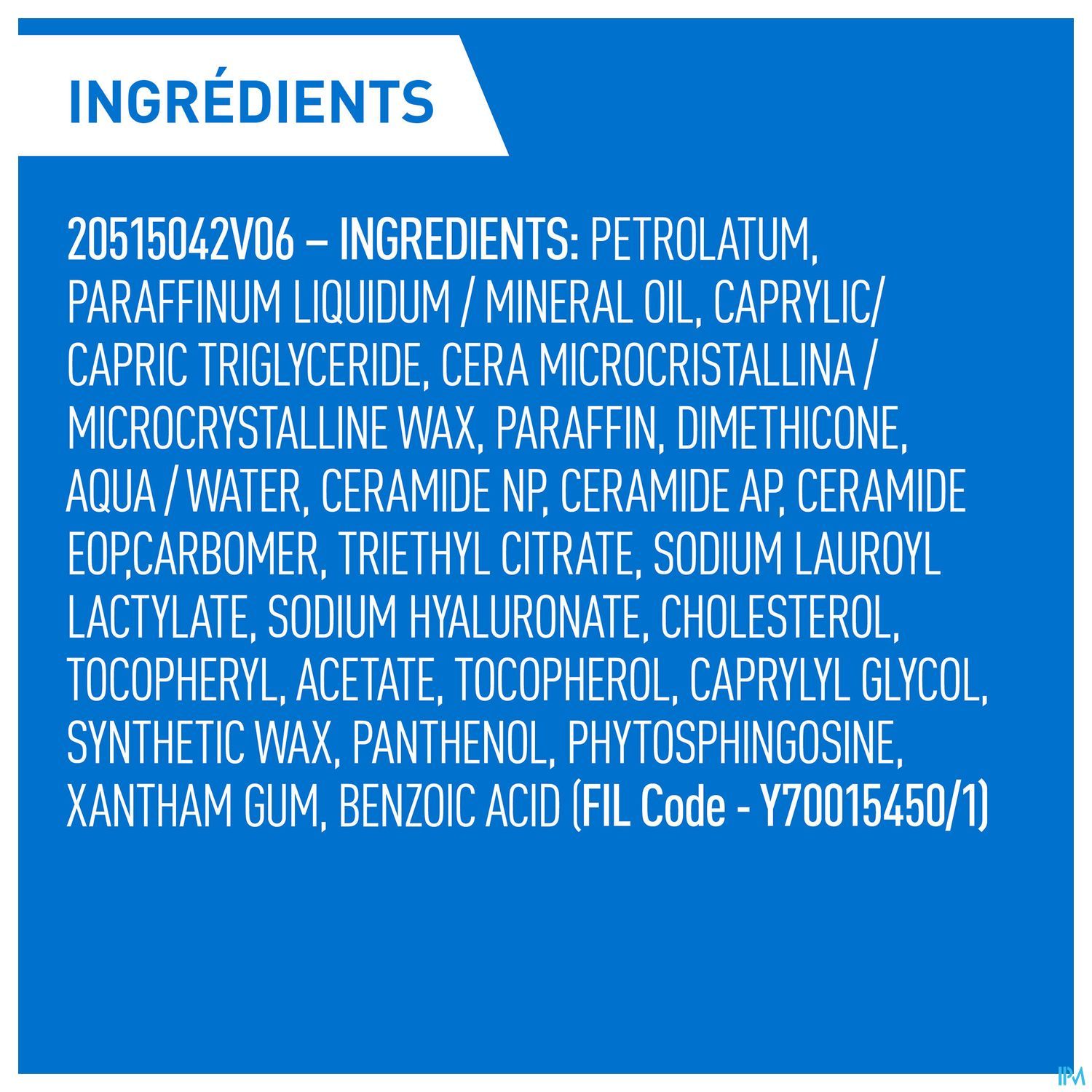 PETROLATUM • PARAFFINUM LIQUIDUM / MINERAL OIL • CERA MICROCRISTALLINA / MICROCRYSTALLINE WAX • PARAFFIN • CAPRYLIC/CAPRIC TRIGLYCERIDE • DIMETHICONE • AQUA / WATER • CERAMIDE NP • CERAMIDE AP • CERAMIDE EOP • CARBOMER • TRIETHYL CITRATE • SODIUM LAUROYL LACTYLATE • SODIUM HYALURONATE • CHOLESTEROL • TOCOPHERYL ACETATE • TOCOPHEROL • CAPRYLYL GLYCOL • SYNTHETIC WAX • PANTHENOL • PHYTOSPHINGOSINE • XANTHAN GUM • BENZOIC ACID