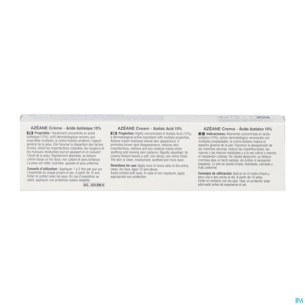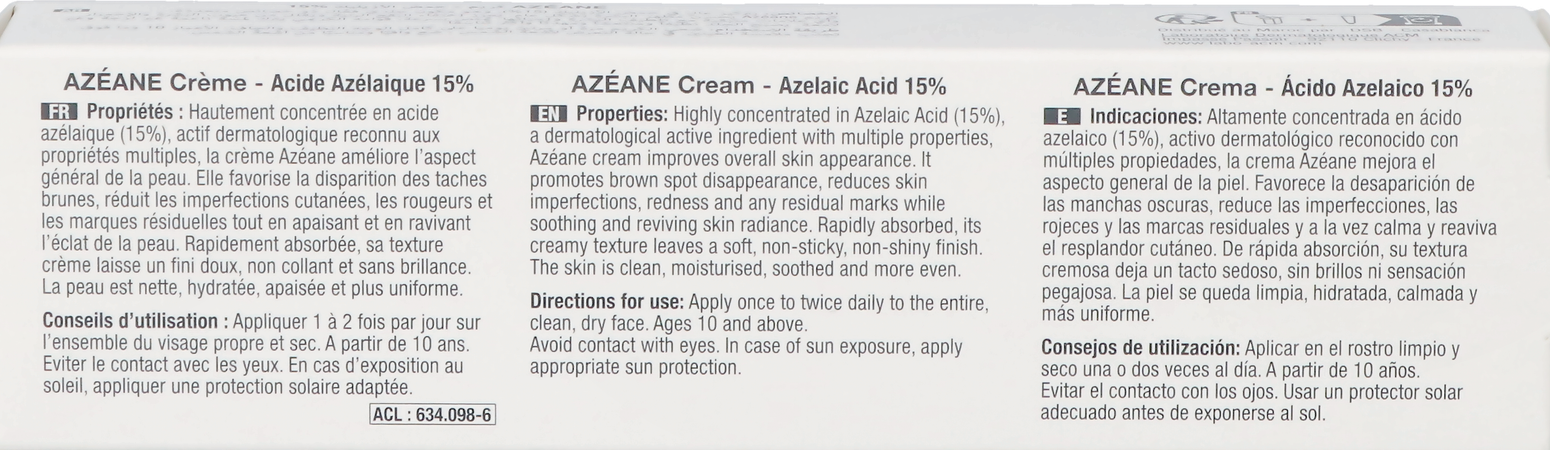 La crème à l'acide azélaïque Azéane est un soin multi-actions qui hydrate et améliore l'aspect général de la peau. Appliquée matin et/ou soir sur le visage, le décolleté et les mains, elle agit simultanément sur les imperfections cutanées, les taches, les rougeurs et le manque d'éclat, avec des résultats visibles dès 7 jours(1,2) !